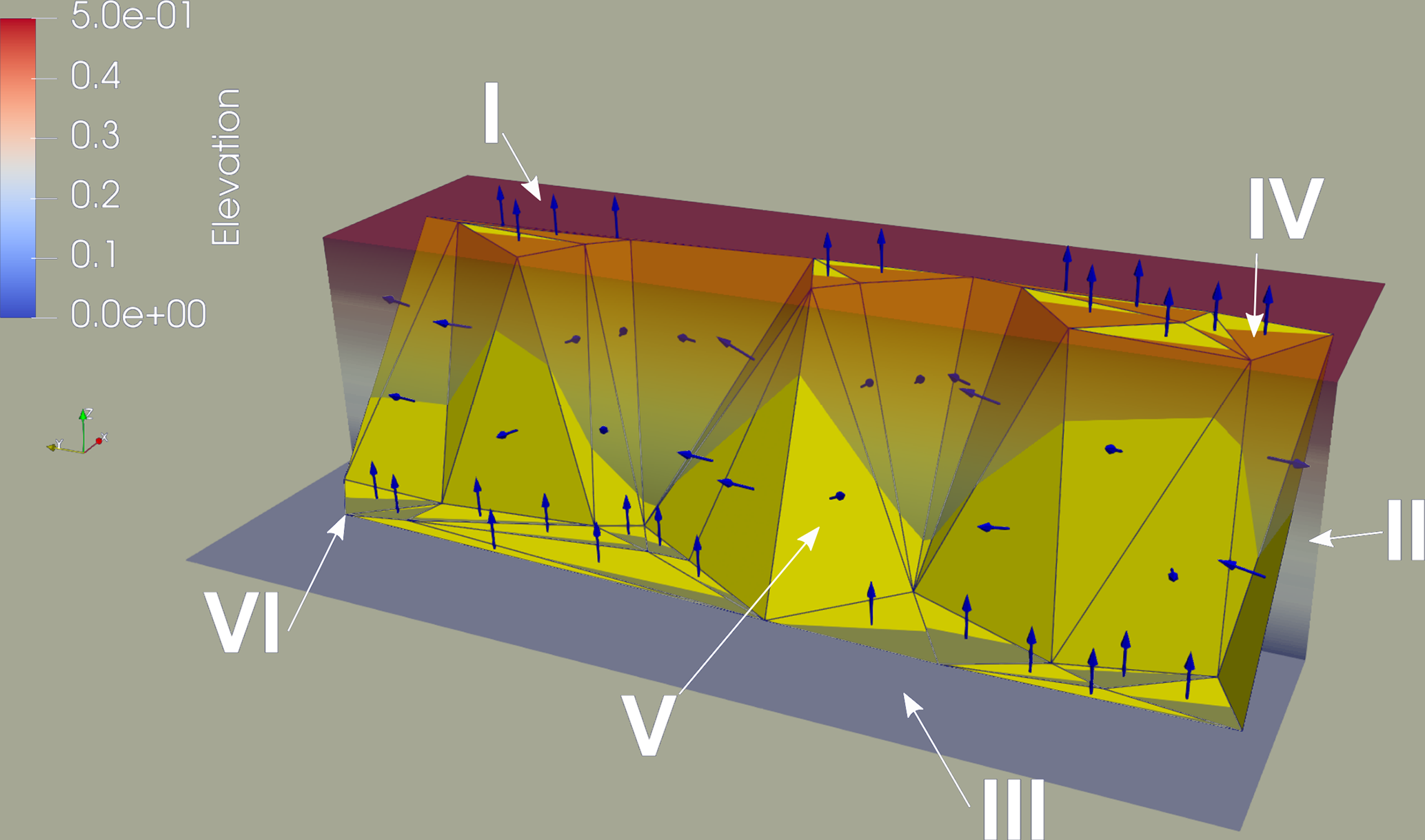 Figure 1Presentation of the terminology used in the study: (I) the surface of the horizontal footwall, (II) the fault plane, (III) the surface of the horizontal hanging wall, (IV) a horizontal triangle that is genetically unrelated to the fault, (V) a triangle which is genetically related to the fault (a fault-related triangle), (VI) a vertex of the triangle (a point corresponding to a geological interface identified by a borehole). We note that, if elevation uncertainties are introduced, there may be non-horizontal triangles that are genetically unrelated to fault (see Fig. 3d).