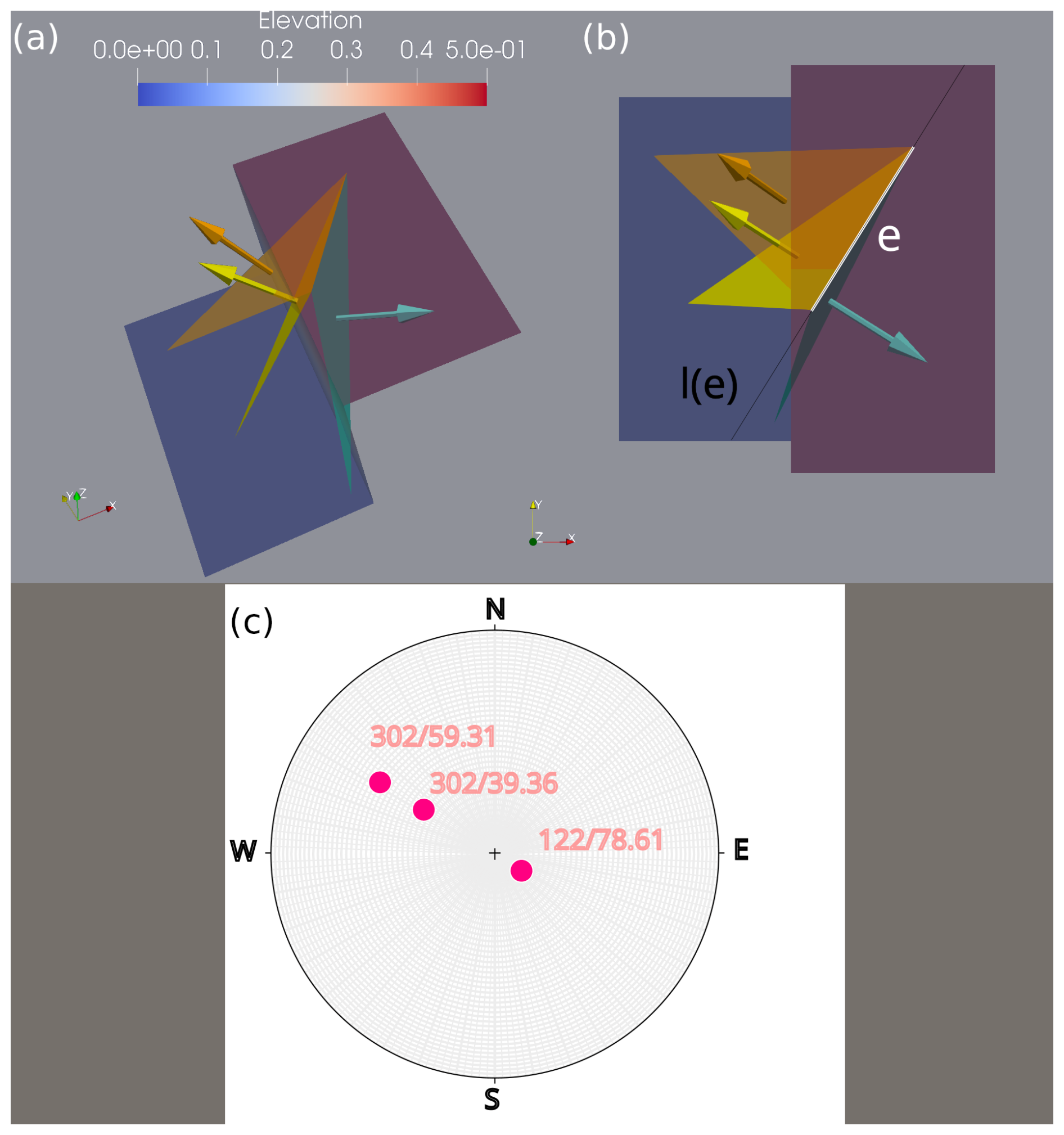 Figure 4Illustration of Proposition 1. There are three triangles that share the same edge on the footwall. Two of the triangles (yellow and orange) have the same dip direction (302°). In other words, the projections of the yellow and orange vectors onto the horizontal plane are parallel. We note that l(e) denotes the line containing e. Then, the remaining points forming the yellow and orange triangles lie to the left to l(e). The third triangle (cyan) has the opposite direction (122°), and the third point lies to the right of l(e). In panel (c), we present the three orientation measurements from panels (a) and (b) on the spherical projection. The spherical projection was performed using the Stereonet software (Allmendinger et al., 2011; Cardozo and Allmendinger, 2013).