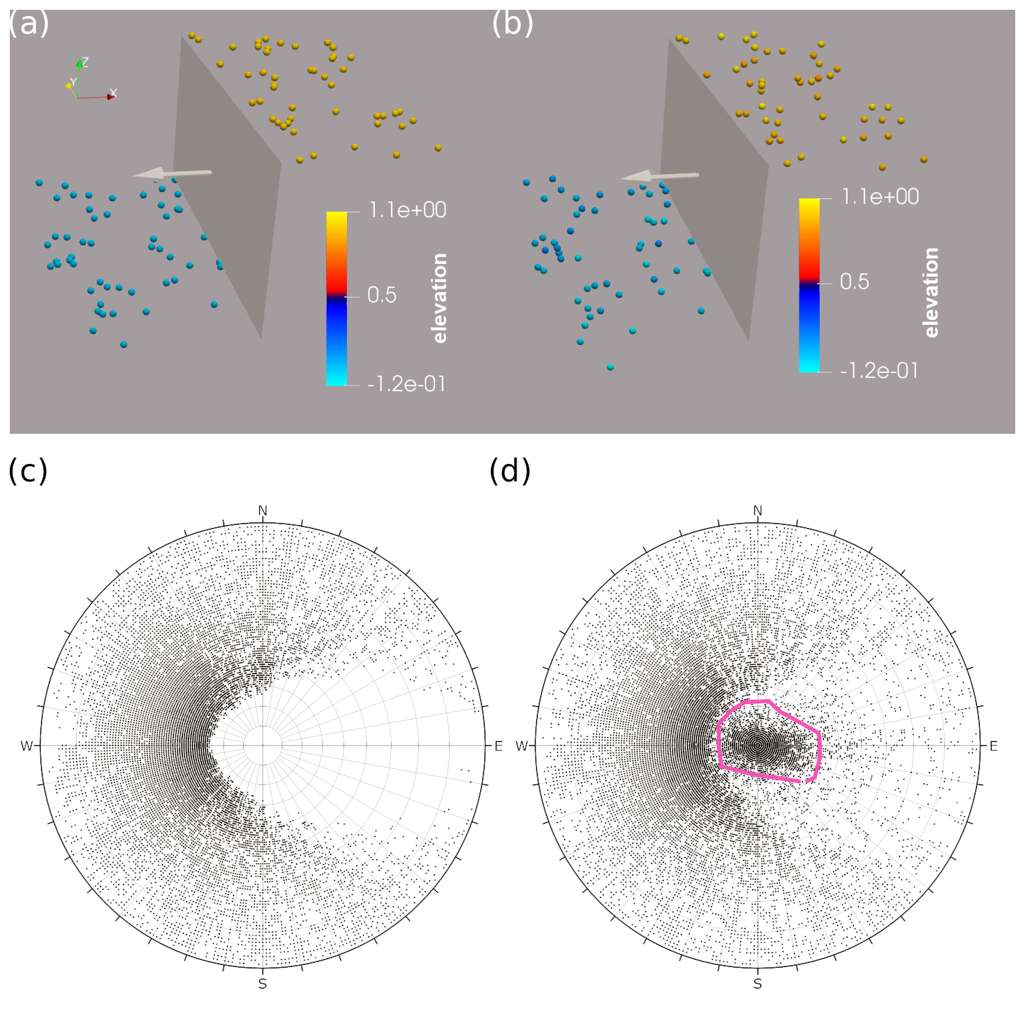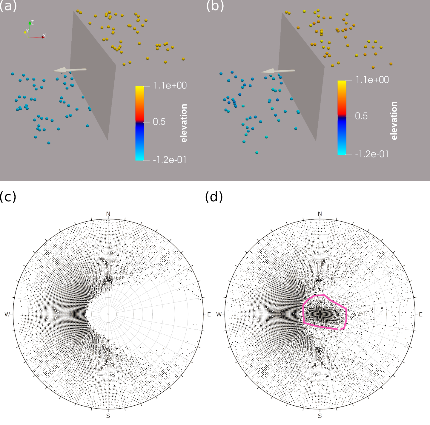Figure 5A geological horizon displaced by a vertical fault; its normal vector points to the west (azimuth 270°). (a) A case study with elevation data without errors. (b) A case study with points having elevation data with errors (mean = 0, standard deviation = 0.05). (c) A spherical projection for the orientation measurements as three-element subsets (n=122 304) of the points corresponding to panel (a). (d) A spherical projection for the orientation measurements as three-element subsets (n=161 700) of the points corresponding to panel (b). The small cloud at the center of the plot (pink polygon) corresponds to almost-flat triangles lying entirely on the same side of the fault. The spherical projection was conducted using Dips software (Rocscience, 2017). We used pole vectors, upper-hemisphere projection, and equal-angle projection.