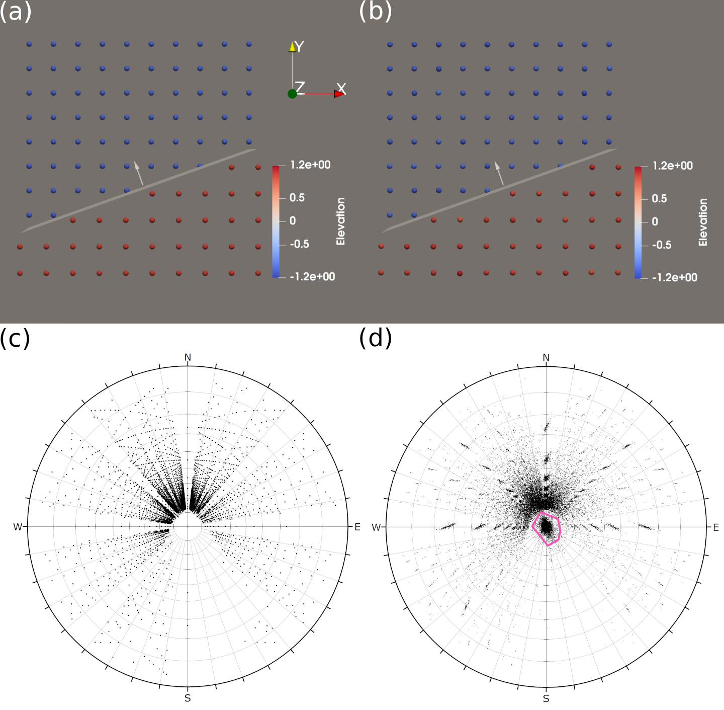 Figure 6Orientation measurements using a combinatorial algorithm for a regular grid of points and a vertical fault trending obliquely to the main axes of the grid. The vertical fault has a normal vector with azimuth 340.43°. (a) Input points without elevation errors. (b) Input points with elevation errors (mean = 0, standard deviation = 0.05). (c) A spherical projection for the orientation measurements as three-element subsets (n=109 111) of the points without elevation errors corresponding to panel (a). (d) A spherical projection for the orientation measurements as three-element subsets (n=157 252) of the points with elevation errors corresponding to panel (b). The small cloud at the center of the plot (pink polygon) corresponds to almost-flat triangles lying entirely on the same side of the fault. The spherical projection was conducted using Dips software (Rocscience, 2017). We used pole vectors, upper-hemisphere projection, and equal-angle projection.