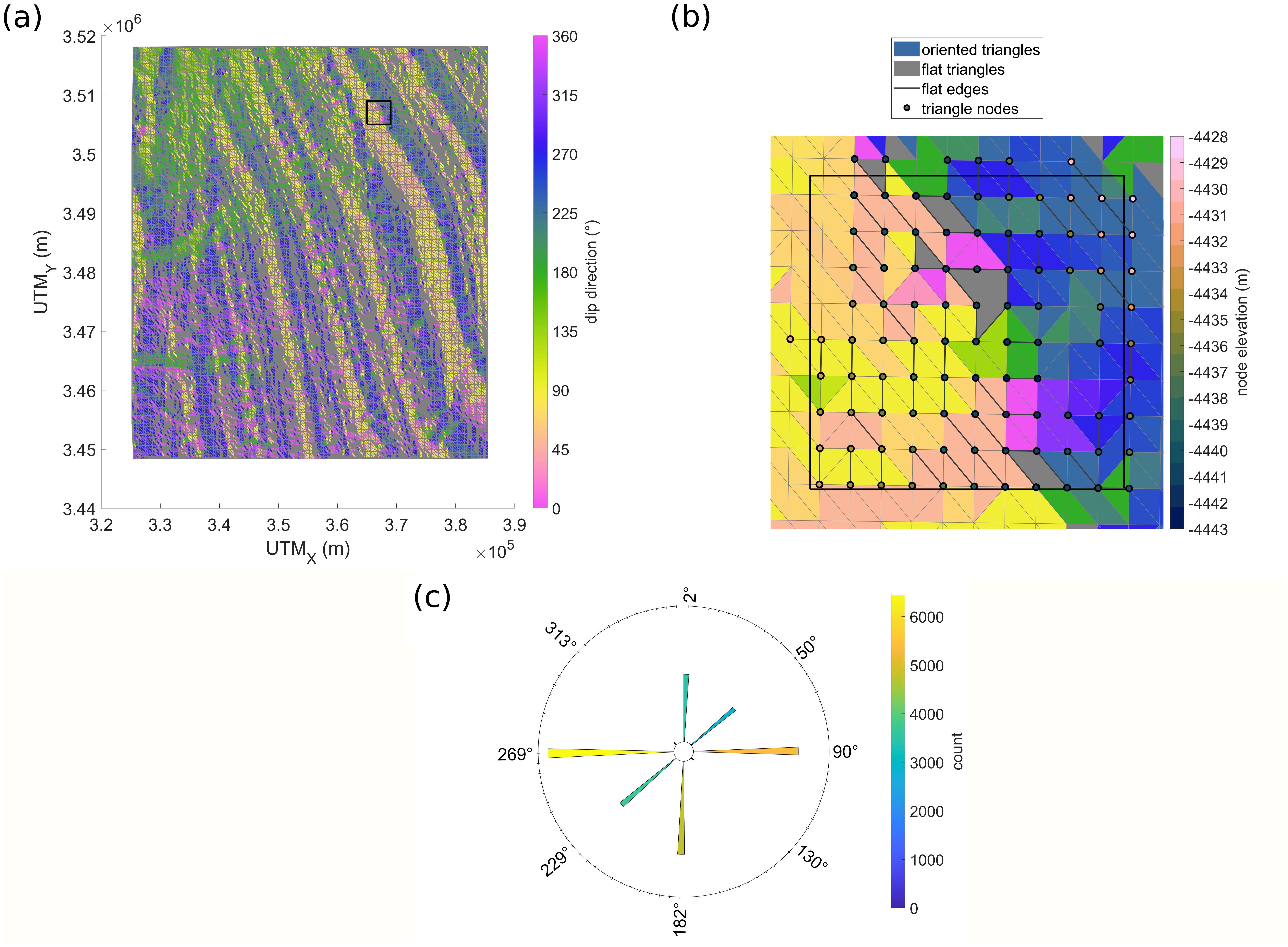 Orientation measurements, such as dip and dip direction, are critical in subsurface geological modeling and are traditionally collected through fieldwork or outcrop analogs (La Fontaine et al., 2021). These measurements serve as input for co-kriging methods, which combine point data with orientation information to model subsurface structures (de la Varga et al., 2019; Lajaunie et al., 1997; Calcagno et al., 2008). More recently, triangulated data have been widely used in geological modeling to represent 3D surfaces (Merland et al., 2014; Collon et al., 2015; Aydin and Caers, 2017). Triangulations, created by connecting points sampled from geological surfaces, allow the analysis of orientation data by calculating the normal vectors of triangles. This approach is valuable in detecting geological features like faults by clustering these vectors (Michalak et al., 2022).