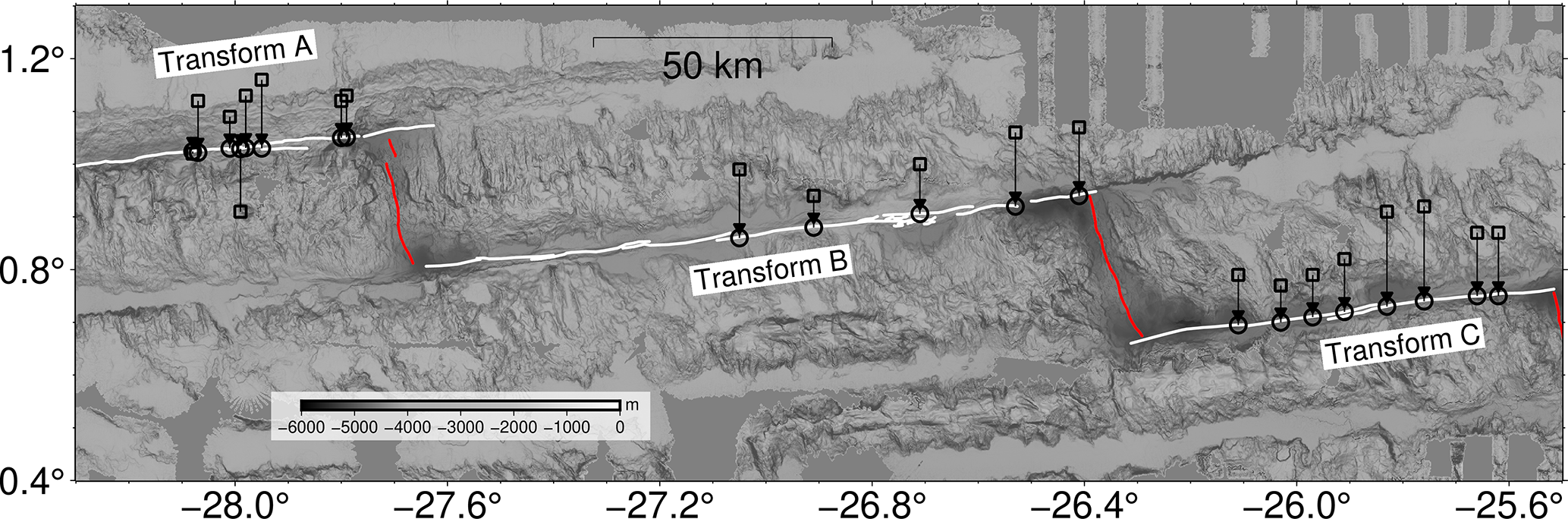At Transform A, the local micro-seismicity has been recorded by a local station installed at SPSPA islets (de Melo and do Nascimento, 2018), revealing a seismically active setting. Fault plane motions analyzed by the GCMT along the SPTS (Figs. 1b and S3 in the Supplement) indicate that most of the solutions are strike-slip, consistent with the main transform fault orientations. However, at Transform A, some solutions differ from the expected transform fault kinematics, confirming complex fault geometry and segmentation. Previous studies reported compressive mechanisms, uncommon for transform fault areas, near the SPSPA islets in Transform A (e.g. Wolfe et al., 1993). Wolfe et al. (1993) identified focal depths reaching up to 14 km below seafloor () in earthquakes that occurred at Transform A, while Engeln et al. (1986) found in strike-slip solutions with a focal depth of 3–7 at the same transform segment. Francis et al. (1978) reported microseismicity with focal depth reaching up to 11 at Transform D. Wolfe et al. (1993) suggested that additional factors may control the occurrence of compressive earthquakes in Transform A, such as recent changes in plate motion, differential lithospheric cooling, or the development of a weakened fault zone. More recently, Maia et al. (2016) favored a southward propagation of the MAR into the transform domain as a possible mechanism generating the large stepovers and associated thrust faults.