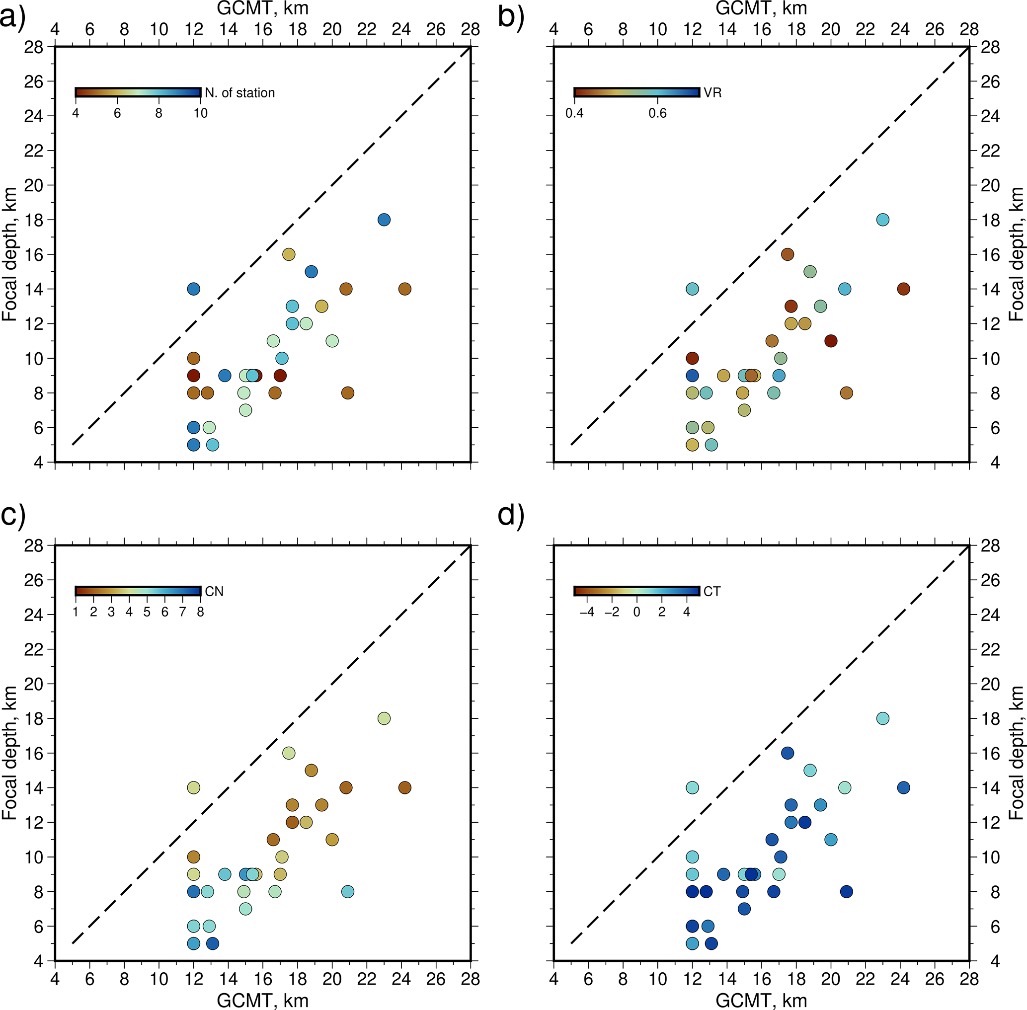 Figure 6Comparison of the focal depth below seafloor analyzed in SPTS using regional records versus GCMT depth. (a) Comparison with the number of stations used in the analysis, presented by the symbol colors. Most of the earthquake had a minimum of six stations used in analysis, with most of the solutions presenting a synthetic/real waveform fitting with VR > 0.5 (b). (c) Symbol color showing the variation of the condition number (CN) of the ISOLA solution referent to each earthquake. Most solutions had CN < 5. (d) Comparison with the centroid-time (CT) obtained in waveform fitting, with most events presenting CT > 0, indicating the existence of a difference between the origin time of the moment tensor solutions of the GCMT with the CT obtained using the regional stations.