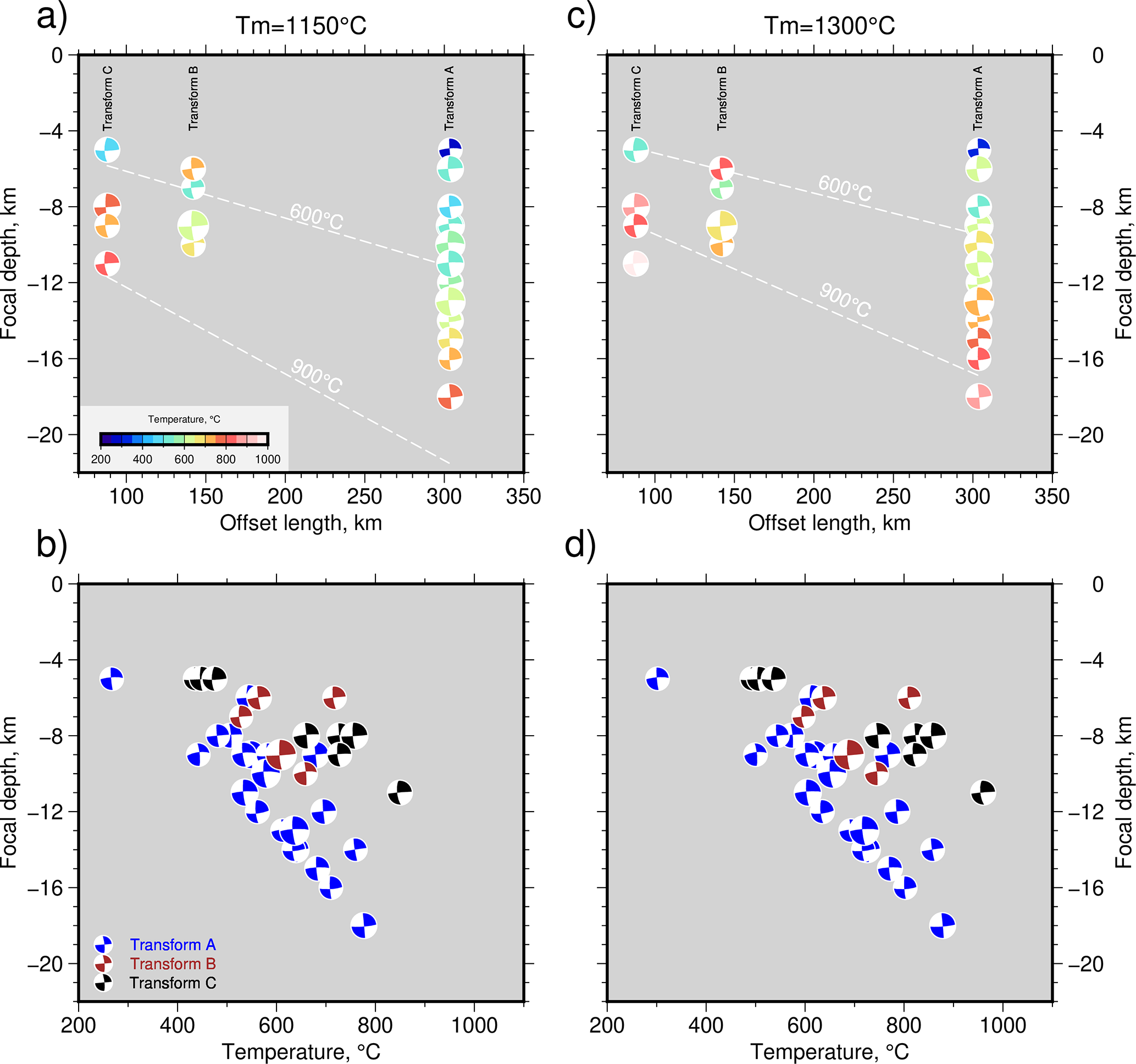 Figure 9(a, b) Comparison of the focal depth with the offset length of the Transform A, B, C (Ren et al., 2022) and calculated temperatures, respectively. A mantle temperature of 1150 °C was assumed for results presented in both (a) and (b). Results obtained using a hotter mantle temperature of 1300 °C is shown in (c) and (d). We can observe a gradual increase of the maximum focal depth with the increase of the offset length, which is expected to occur along the half-space cooling.