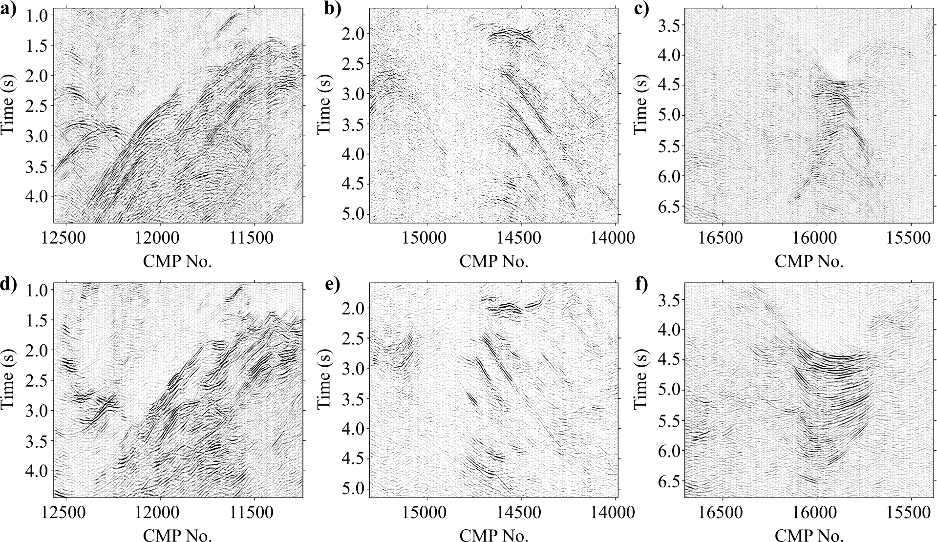 The reprocessing of the GS-02 seismic reflection profile was designed to maximize the imaging of crustal structures by applying a modern workflow, detailed in Table 1. Key processing steps included defining geometry, refraction static corrections, amplitude recovery, noise suppression using 1D and 2D filters, velocity analysis, residual static corrections, and, finally, prestack time migration. The lattermost, which was performed using a 2D Kirchhoff migration algorithm, yielded the most significant improvement in the dataset. To ensure optimal results, the velocity model was constructed sequentially and iteratively, starting from the shallow subsurface and progressively building the velocity model into deeper layers. Figure 3 illustrates a comparison of different portions of the reflection profile without and with the prestack migration. Panels a and d highlight fold and thrust features that are only resolved after migration, panels (b) and (e) show the correct positioning by the migration of dipping reflectors, as well as the enhancement of more subtle parallel reflectors, and panels (c) and (f) demonstrate how the migration has revealed a strong package of complex reflection signals at depth that has been constructed from deep diffraction signals. The various features observed in Fig. 3 are typical of seismic data collected over fold and thrust belts, and hard rock environments, demonstrating the necessity for effective migration in such settings.