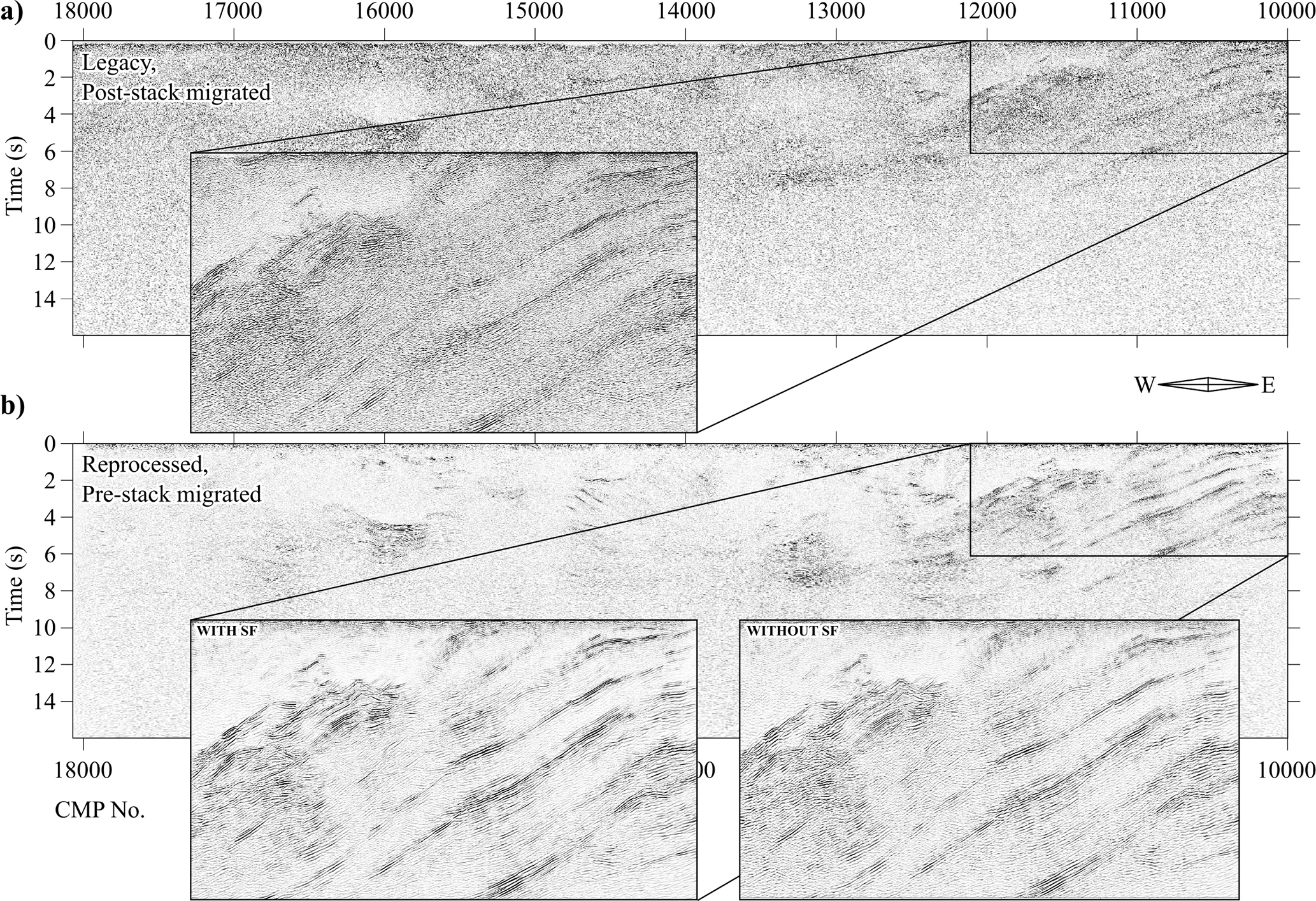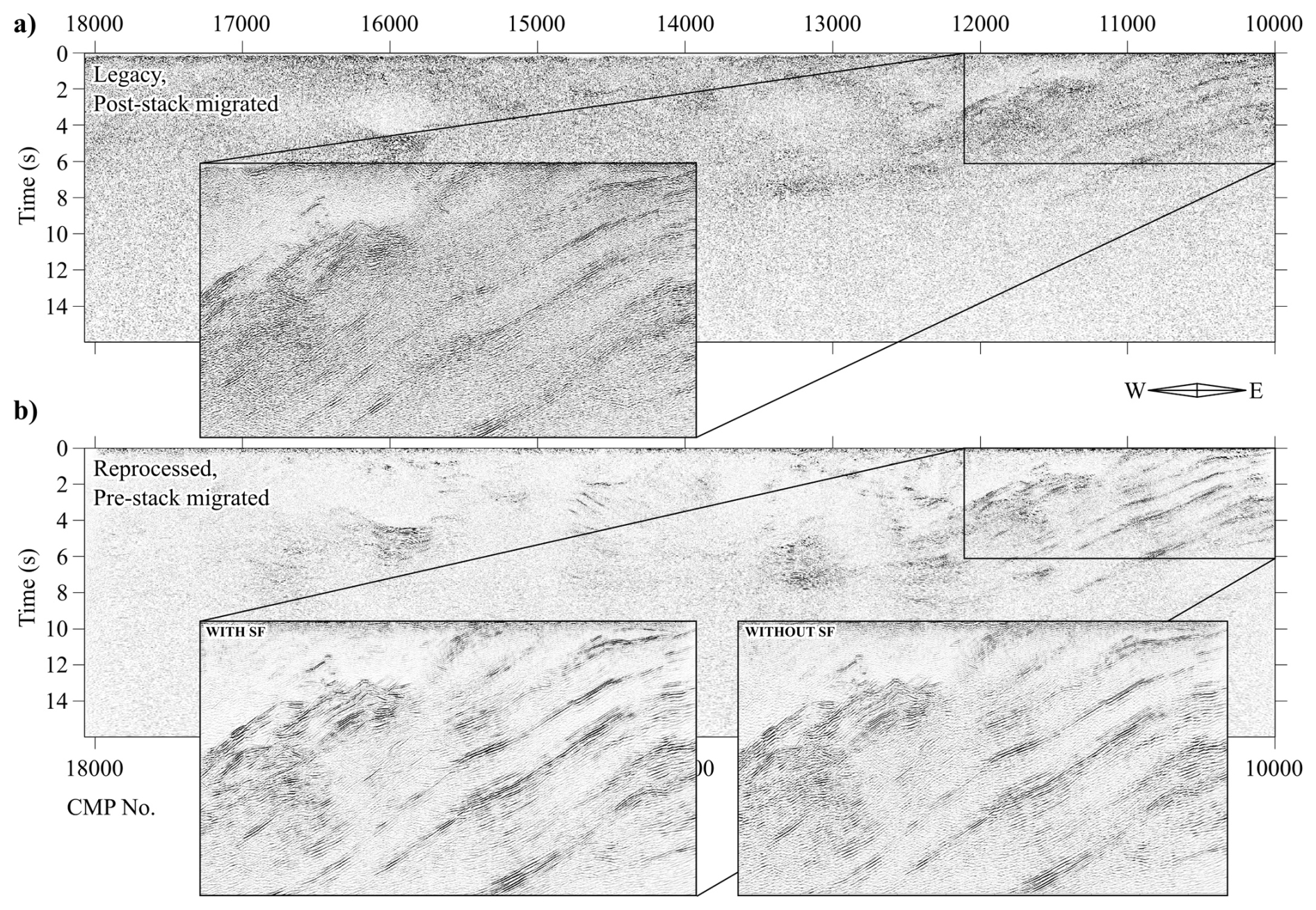 Figure 6A comparison window of the GS-02 profile from (a) the 1998 migrated section, and (b) the reprocessed and pre-stack migrated section, with inset windows showing a portion of the reprocessed section with and without semblance filtering.