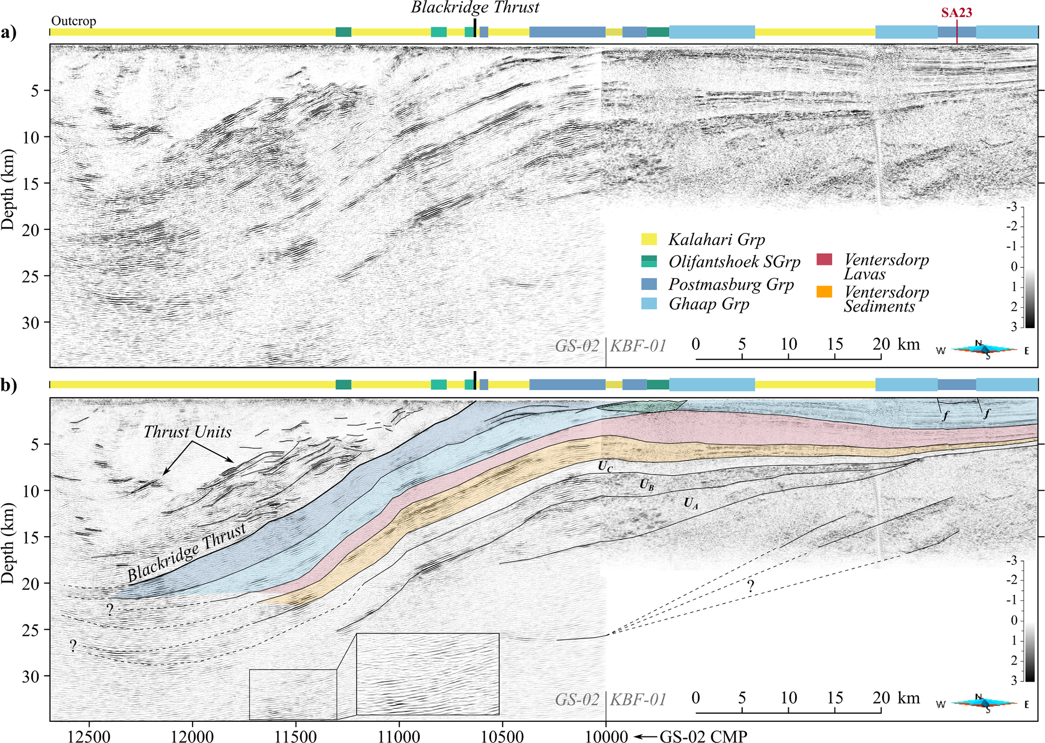 The eastern portion of the profile is shown alongside the KBF-01 profile from Westgate et al. (2020) in Fig. 7. Seismic horizons correlate well across the two profiles and structures can be tracked effectively from the more-documented KBF-01 profile (Tinker et al., 2002; Westgate et al., 2020). This portion of the reprocessed GS-02 profile is characterized by westward-dipping horizons, with an average dip of 25°, that are a clear continuation of the supracrustal horizons identified in KBF-01, where they flatten out towards the east, where they outcrop (Fig. 7). Based on the interpretation by Tinker et al. (2002), these seismic horizons represent units from the Ghaap and Postmasburg Groups of the Transvaal Supergroup, which overlies the sediments and lavas of the Ventersdorp Supergroup. The total thickness of the reflective package, from the base of the Ventersdorp sediments to the top of the Postmasburg Group, averages 6 km in the east where they are flat, and 9 km where they dip towards the west. The boundary of their western extent is obscured by a lack of reflectivity, but they appear to pinch out at depths of 20 to 30 km. Beneath the Ventersdorp sediments are three layers of distinct reflectivity, marked UA,UB, and UC in Fig. 7 after Tinker et al. (2002), that do not outcrop and pinchout beneath the Ventersdorp sediments in the east. These units attain a maximum collective thickness of 8 km where the two seismic profiles intersect.