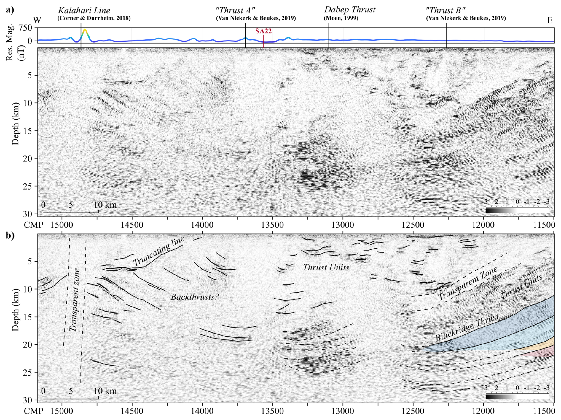 Our results provide new seismic evidence supporting the presence of Thrust A, as proposed by Van Niekerk and Beukes (2019). In the reflection profile, Thrust A appears as a discrete, west-verging reflection that truncates underlying reflectors (Fig. 8). The geometry of these underlying reflections is consistent with the structural interpretation of a back-thrust within the Kheis Province. Additionally, Thrust A's location coincides with a subtle magnetic anomaly that could be supportive of its identification as a thrust plane.