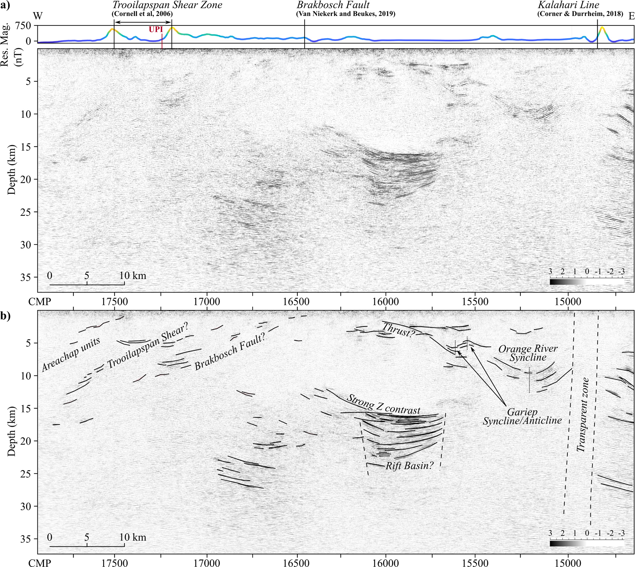 Figure 9 shows the western portion of the profile. Starting from the east, a series of concave-up reflections is observed directly west of the Kalahari Line transparent zone, between CMPs 15 000 and 15 500, and at depths around 10 km. This is located directly beneath the intersection of the seismic profile with the fold trace of the plunging Orange River Syncline (Van Niekerk and Beukes, 2019). Directly to the west, centered on CMP 15 550 at 4 km depth, is a set of reflections that exhibit alternating up-down concavity, interpreted as the Gariep Anticline/Syncline pair. Accompanying these signals is a subtle basal reflection that has an eastward dip of about 20°. The crosscutting nature of this reflection and its orientation are reminiscent of a thrust fault. Extending this reflection to the surface results with it coinciding with a local magnetic high near CMP 16 200 (Fig. 9a). Further below, at depths of 13 to 20 km is a distinctive series of upward-curved reflections. The amplitudes near the top of these reflections are strong and continuous, and are preceded in depth by a strikingly clear zone with little reflectivity, indicating a strong acoustic impedance contrast and an absence of any notable reflectors at shallower depths (except within the first 5 km). The reflections within the package group into two sets of crosscutting reflection patterns, one horizontal, and one that curves upward in the western direction. Stettler et al. (1998) noted that a similar and parallel feature is observed in other seismic sections in Botswana, and that little is known about its nature. The package bears similar characteristics to a buried valley, potentially sill-intruded, but explanations as to how such a valley could be buried and preserved at depths of 20 km require more investigations. The upward-concave shape, along with the well-bounded lateral terminations of reflectivity, could alternatively indicate a filled extensional structure, suggesting a more plausible interpretation of a syn-tectonic sedimentary basin or a relict rift basin formed during an extensional phase. If this is true, it explains the sudden truncation of the package flanks as bounding faults. West of this package, from about CMP 16 300 eastwards, reflections become sparse and incoherent, impeding the clarity of interpretation. Notable reflections include collection of parallel, east-dipping reflectors between CMPs 16 500 and 17 000 at depths from 20 to 27 km, as well as some shallower, isolated packages that all have roughly the same westward dip, and extend from the surface near CMP 16 500 to a 15–18 km depth at the western edge of the seismic profile. The geometry of these packages contrast with the forementioned deeper reflectors, suggesting a different stratigraphic or tectonic setting. In terms of surficial observations, this westernmost section of the profile coincides with the Brackbosch-Trooilapspan Shear Zone. In the literature, the Brackbosch and Trooilapspan structures are conventionally assumed to be connected and continuous. However, Van Niekerk and Beukes (2019) allude to a fault seen in both satellite and aeromagnetic data (Fig. 2) that departs from the shear zone somewhere along the transition between the Brackbosch and Trooilapspan components, which is taken as a northern extension of the Brackbosch Fault. This fault, which is seen in Fig. 2a extends to the profile where it meets the southern “hook” of the Kalahari Line in the magnetic map. This conjunction coincides with the basal surface extension of the isolated, westward-dipping packages at CMP 16 500 of Fig. 9. Further west near CMPs 172 50–17 500 is the surface and magnetic expression of the Troolapspan Shear Zone, which coincides to the upper reflections of the same package. This complex geometry could be suggestive of a broad shear zone, with the Brackbosch Fault extension as its base. In terms of the geology, west of this region coincides with outcrops that belong to the Areachap domain (Fig. 2d). The incoherent reflectivity could be the result of a dispersive and chaotic wavefield caused by the crystalline Areachap units. Fabric destruction along the steep fault zone may also explain the scarcity of continuous reflections within the region.