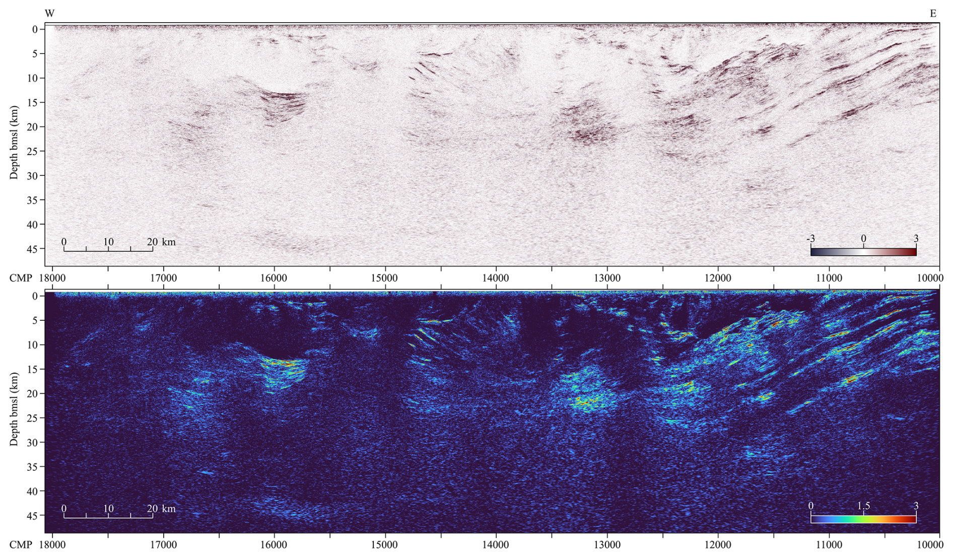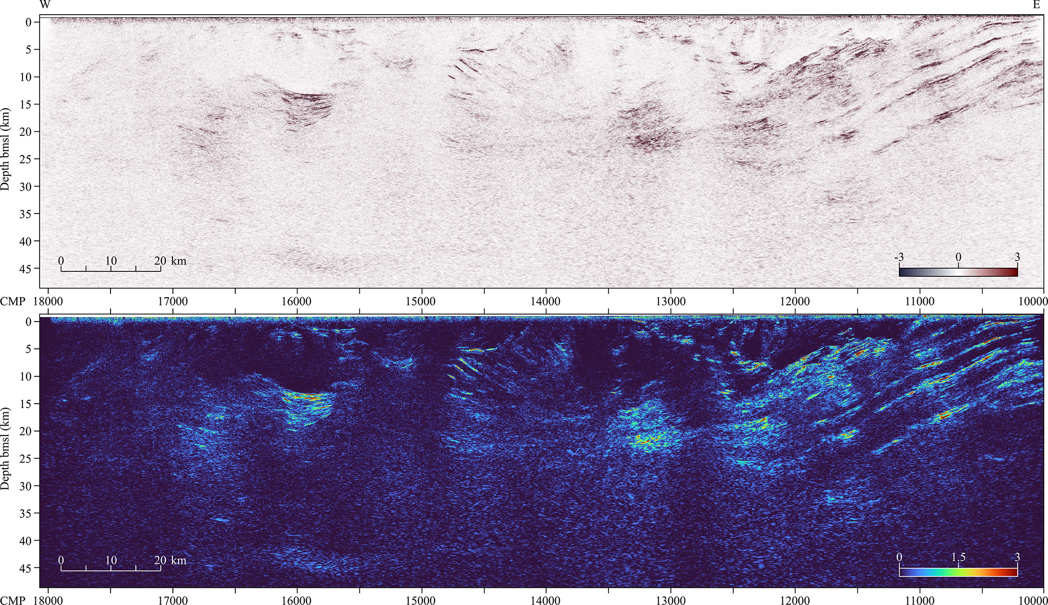 The reprocessed GS-02 profile is shown in its entirety in Fig. 5 (the amplitude envelope is plotted for display purposes). A time-to-depth conversion was performed using a velocity model obtained from converting the RMS velocity model, which itself was constructed from constant velocity analysis of the reflection signals, to interval velocities and applying a series of smoothing filters. The maximum depth after time-to-depth conversion is approximately 40 km, with obvious reflections observed down to 38 km depth. In general, the section exhibits a series of strong and mostly clear dipping reflections in the eastern portion of the profile, followed by chaotic reflectivity moving to the west, with multiple truncated and localized reflections at varying depths. The western half of the profile also has various localized reflectors, including a large, deep concave-up reflection package. The far western end is mostly transparent.