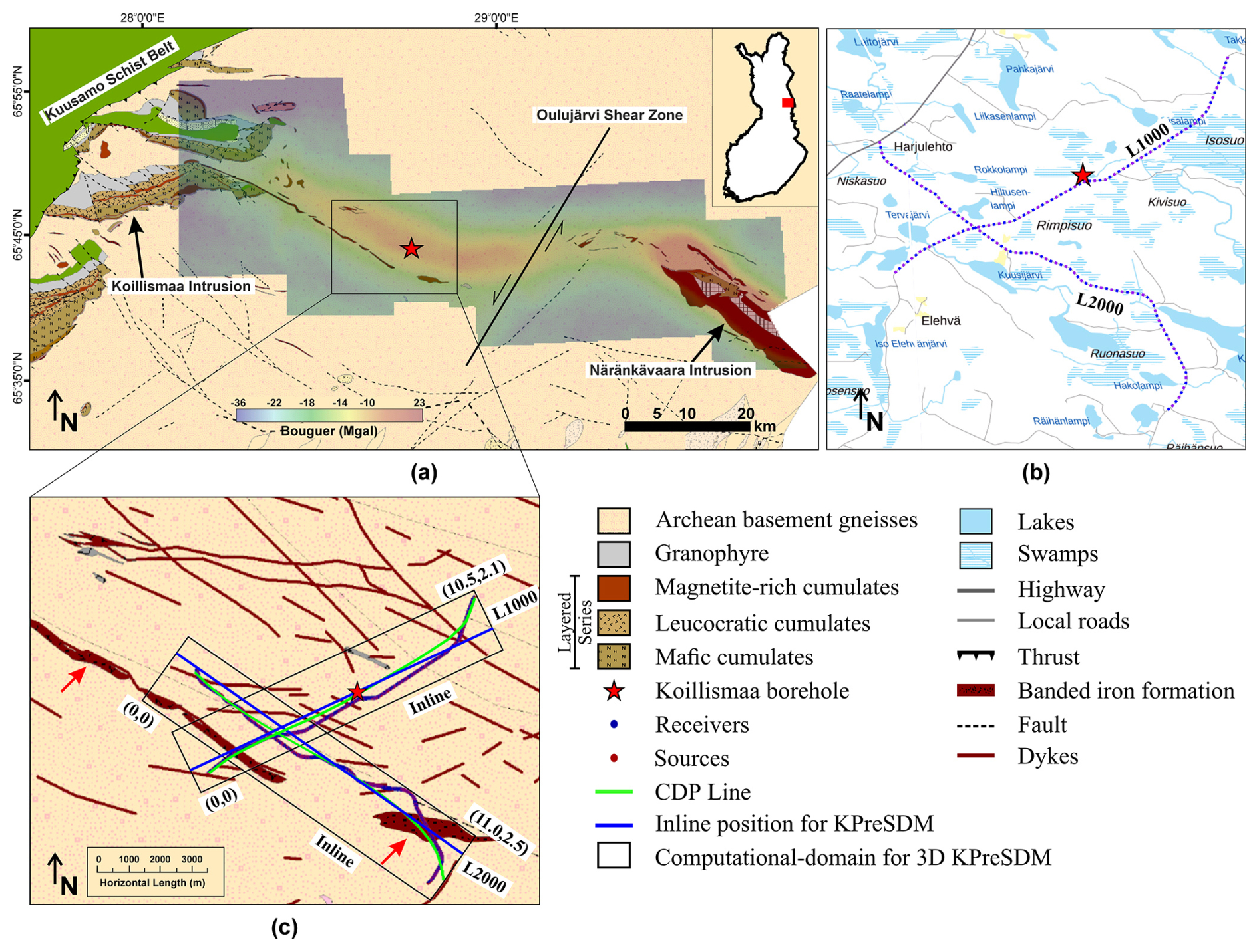 Figure 1(a) Generalized geological map of the KLIC with the Koillismaa intrusion in the west and the Näränkävaara intrusion in the east (Geological map is from “Bedrock of Finland v2.3 at the scale 1:200 000”; Bedrock of Finland, 2019). The study area is indicated by the red rectangle on the map of Finland in the top-right inset (© Google Maps). A Bouguer gravity anomaly map is overlaid over the geological map. The red star marks the Koillismaa drillhole. (b) Seismic profiles (L1000 and L2000) overlaid on the topographic map. (c) Acquisition profiles overlaid over the geological map. Purple and blue dots mark the position of the shotpoints and receivers, respectively. The green lines show the processing lines (CDP binning line) for each profile. The black boxes show the computational domain for depth migration (in km). The blue lines indicate the position of the inline at which the results from Kirchhoff prestack depth migration (KPreSDM) are shown in Figs. 5c and 6b. Red arrows mark the banded iron formations (BIFs).