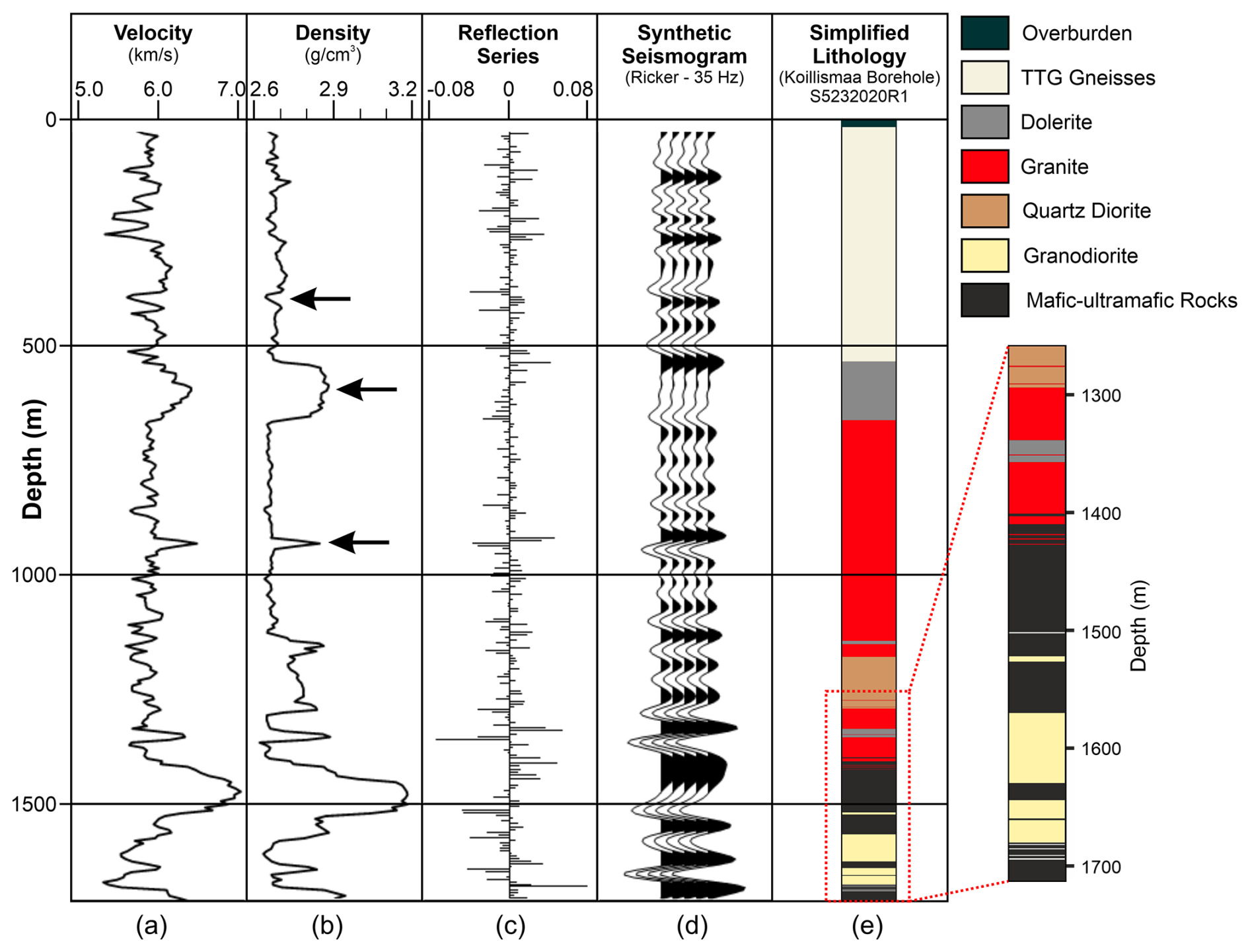 Figure 3Panels (a), (b) and (c) show plot of P-wave velocity, density and reflection coefficient series based on the laboratory measurements on core samples from the Koillismaa drillhole (red star, Fig. 1), (d) synthetic seismogram produced using a Ricker wavelet with dominant frequency 35 Hz highlighting the acoustic impedance contrast between different lithologies, (e) simplified lithology of the drilhole (same as in Fig. 2). Drilling shows the surface bedrock geology to be composed of homogenous orthogneisses, cross-cutting dykes and the magma conduit characterized by the mafic–ultramafic rocks at an approx. depth of 1.4 km from the surface. Black arrows in panel (b) mark the events for which reflectivity was observed in the walkaway VSP study done in the drillhole.