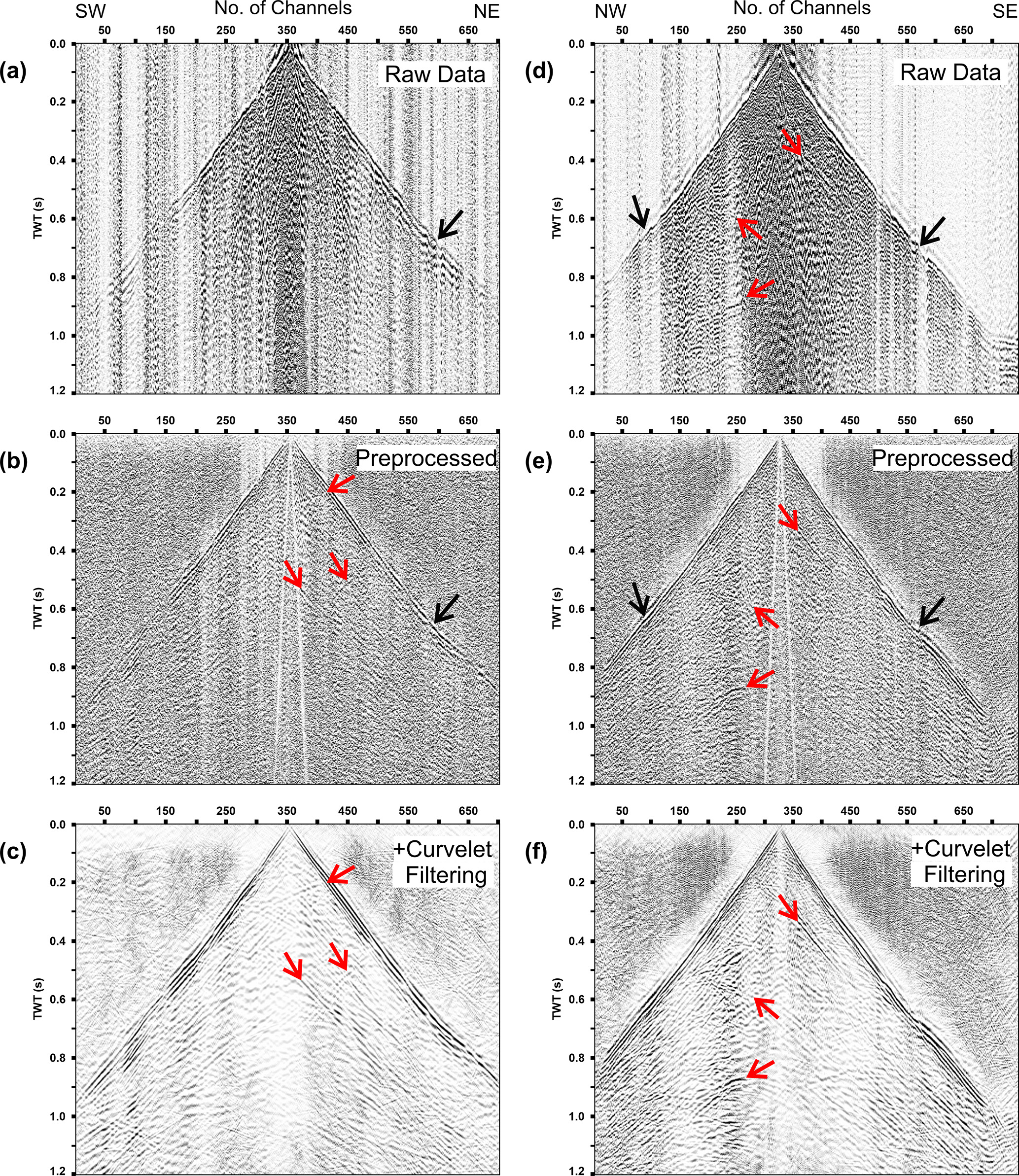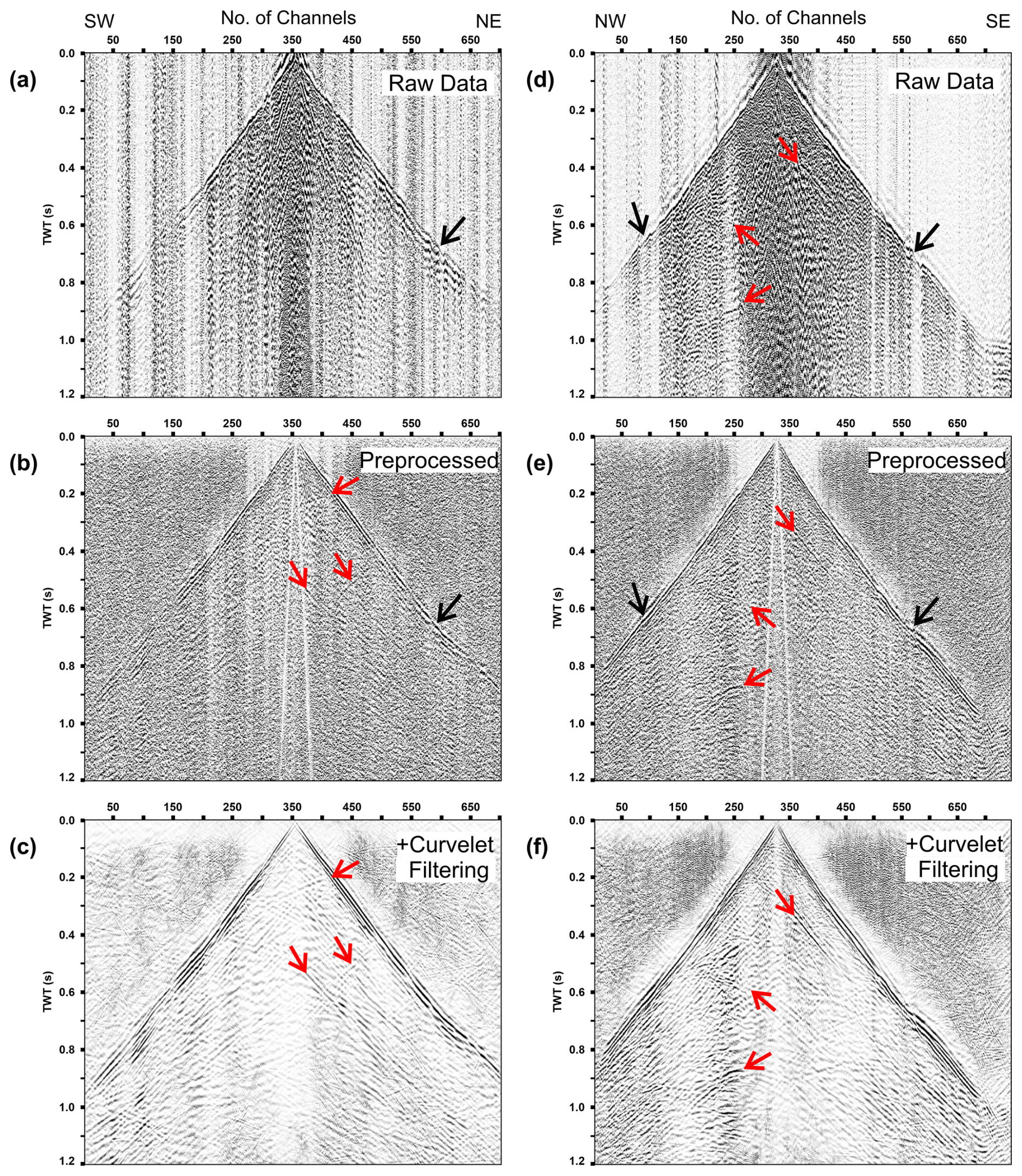 Figure 4Result of the data preprocessing applied to profiles L1000 and L2000. (a) Raw shot gather for profile L1000, (b) data with full preprocessing without the top-mute, and (c) is the same as (b) with curvelet filtering. Trace balancing was applied for presentation purposes. (d), (e) and (f) are the same as (a), (b) and (c) for profile L2000. Black arrows show the correction of first arrivals due to the heterogeneous near-surface weathered layer. Red arrows mark the comparative enhancement/preservation of reflectivity in the raw shot gathers.