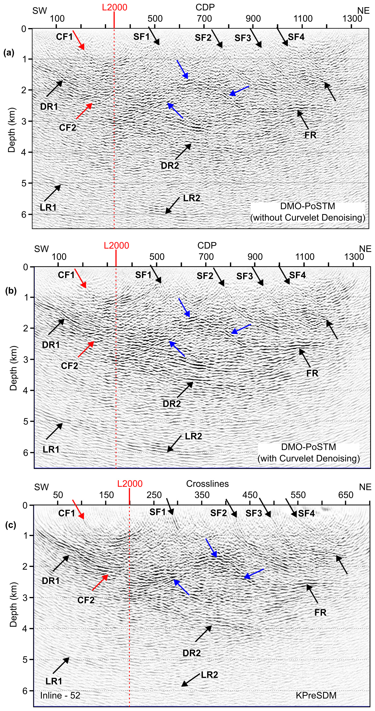 Figure 5Imaging results for profile L1000. 2D DMO-PoSTM without curvelet denoising (a), with curvelet denoising applied (b), and 3D KPreSDM – central inline (c). Black arrows show delineated reflectors at various depths and blue arrows mark the likely extent of the arcuate reflectivity. Red arrows mark the presence of crosscutting reflectors. The red dashed line shows the intersection location of profile L2000 with L1000.