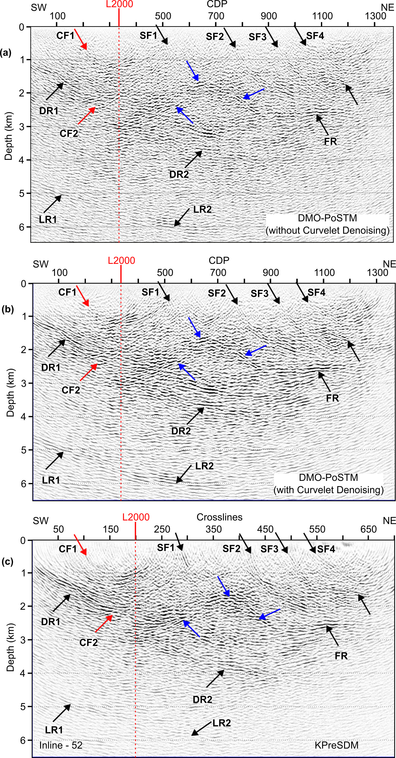 Figure 5c shows the result for 3D KPreSDM along an inline position shown by the blue line in Fig. 1c. The inline crosscuts the curved CDP line as a straight line shown in Fig. 5a and b; therefore, the assessment here is only done on a comparative basis. Overall, the events for KPreSDM results are much more focussed and continuous compared to DMO-PoSTM results (compare Fig. 5b with Fig. 5c). For example, the continuity of events SF1–SF4 are much better imaged. The central arcuate reflectivity is also better delineated along with other events except for the deeper reflectors marked as LR1 and LR2, for which higher migration velocities/aperture are required.