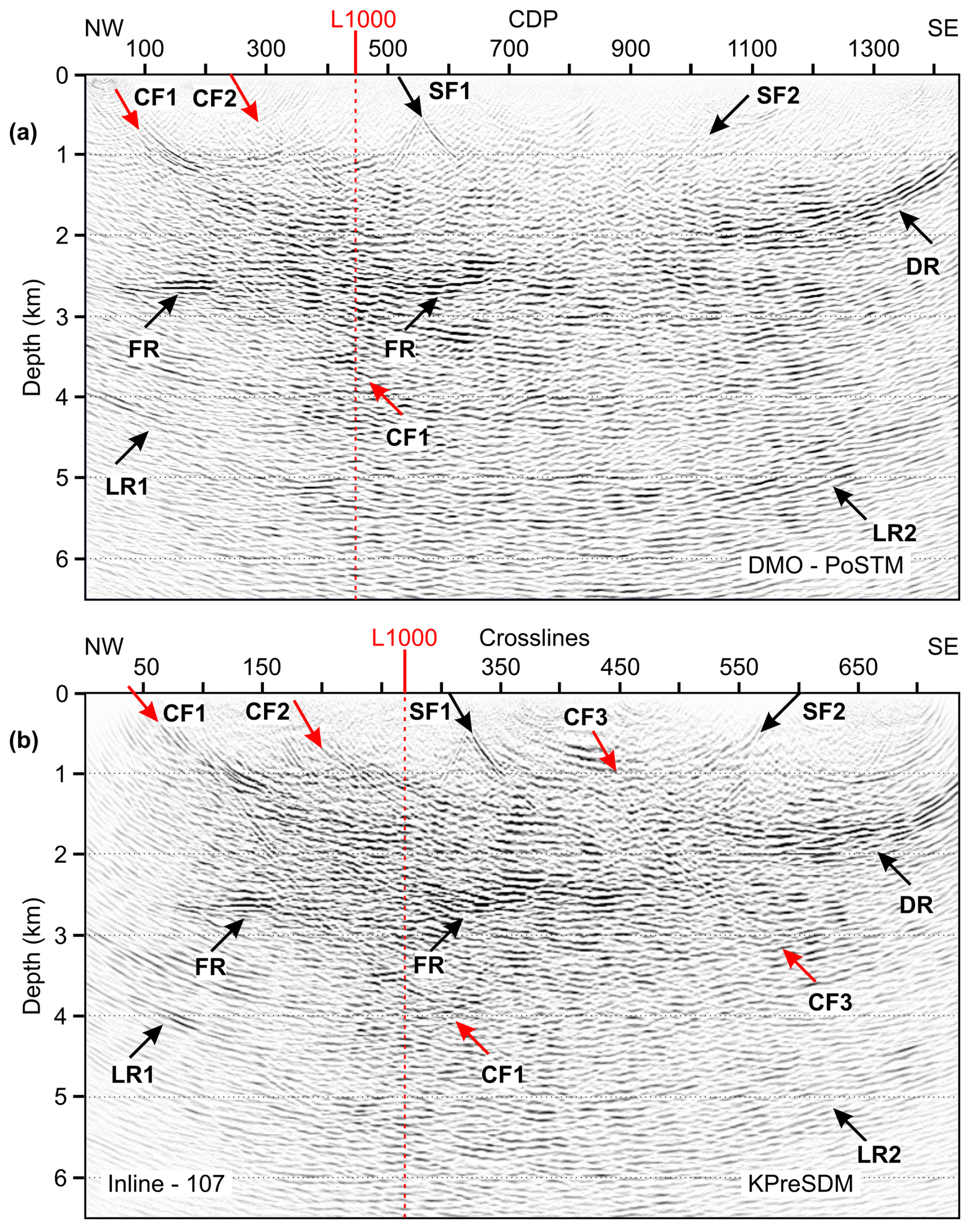 Similar to Fig. 5, Fig. 6 shows imaging results for profile L2000. Figure 6a shows the result for DMO-PoSTM with curvelet denoising applied in the preprocessing stage. Black arrows mark different reflectors mapped in the area at various depth levels. Similar to profile L1000, events are less focussed in the first kilometre with some visible reflectivity marked by black arrows (SF1 and SF2 – not the same events shown in Fig. 5, same is valid for other marked events in Fig. 6). There are hints of several cross-cutting events at the regional scale, although these events are weak to mark their clear extents (red arrows, CF1 and CF2). The reflector marked as CF1 is delineated clearly up to a depth of ∼ 4 km. Similar to profile L1000, a horizontal reflector is mapped at a depth of ∼ 2.8 km (black arrows, FR). There is also the presence of deeper reflectivity marked by black arrows (LR1; depth ∼ 4 km, and LR2; depth ∼ 5 km). A package of dipping reflectivity at the southeastern end of the profile is also mapped at a depth of ∼ 1–2 km (marked as DR). Figure 6b shows results for 3D KPreSDM. The inline location is shown as the blue line in Fig. 1c. Same as for profile L1000, KPreSDM results are better focussed than DMO-PoSTM results (compare Fig. 6a with Fig. 6b). A notable difference can be seen for the reflector (CF3, red arrows) which is almost absent in the DMO-PoSTM result.