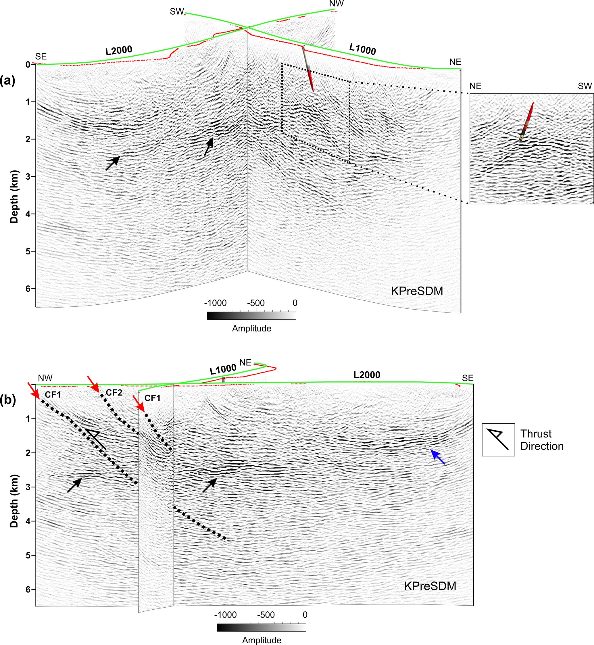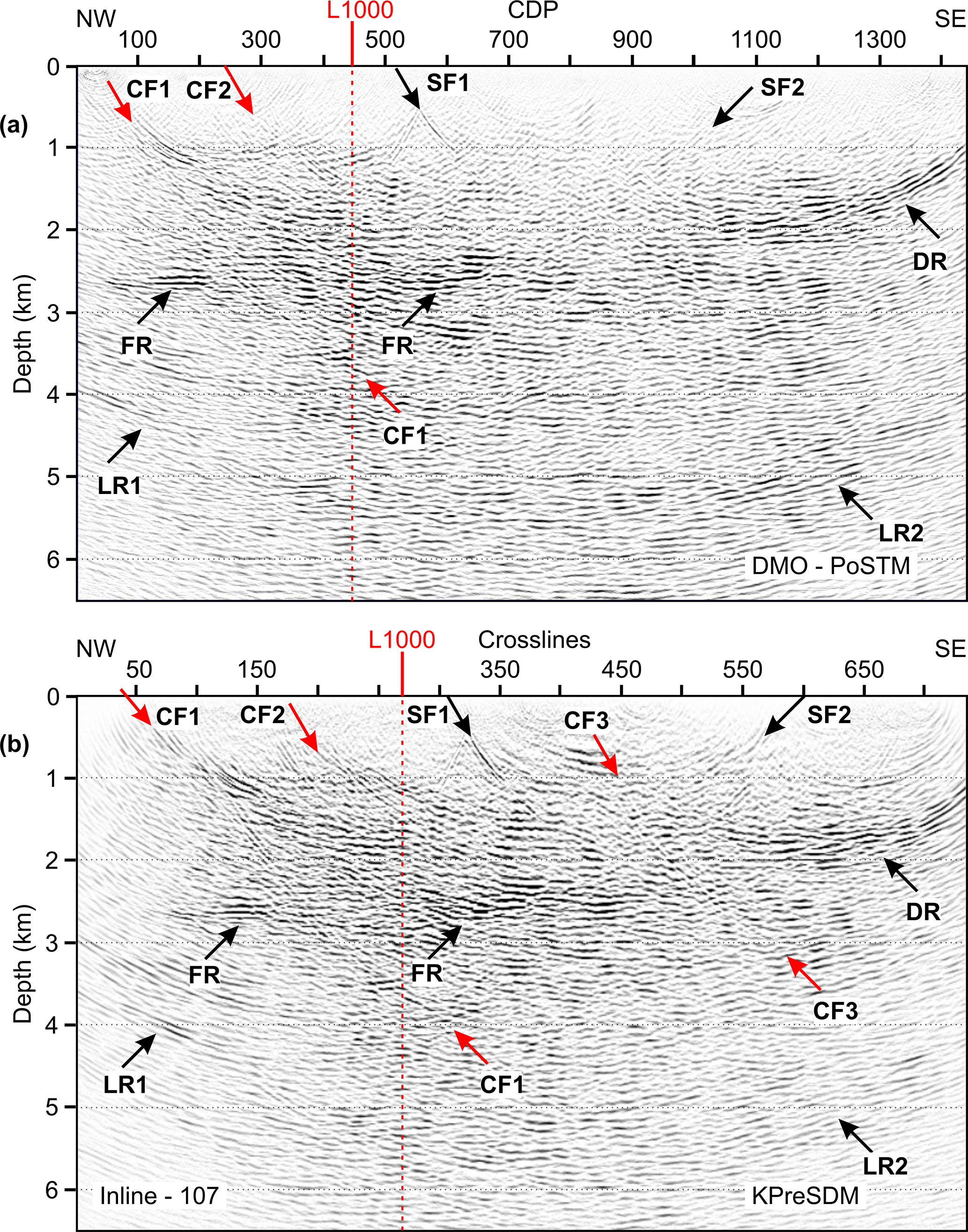 Figure 6Imaging results for profile L2000. (a) 2D DMO-PoSTM, (b) 3D KPreSDM (central inline). Black arrows show imaged reflectivity at various depths in the area. Red arrows mark the steeply dipping cross-cutting reflectors. The red dashed line shows the intersection location of profile L1000 with L2000.