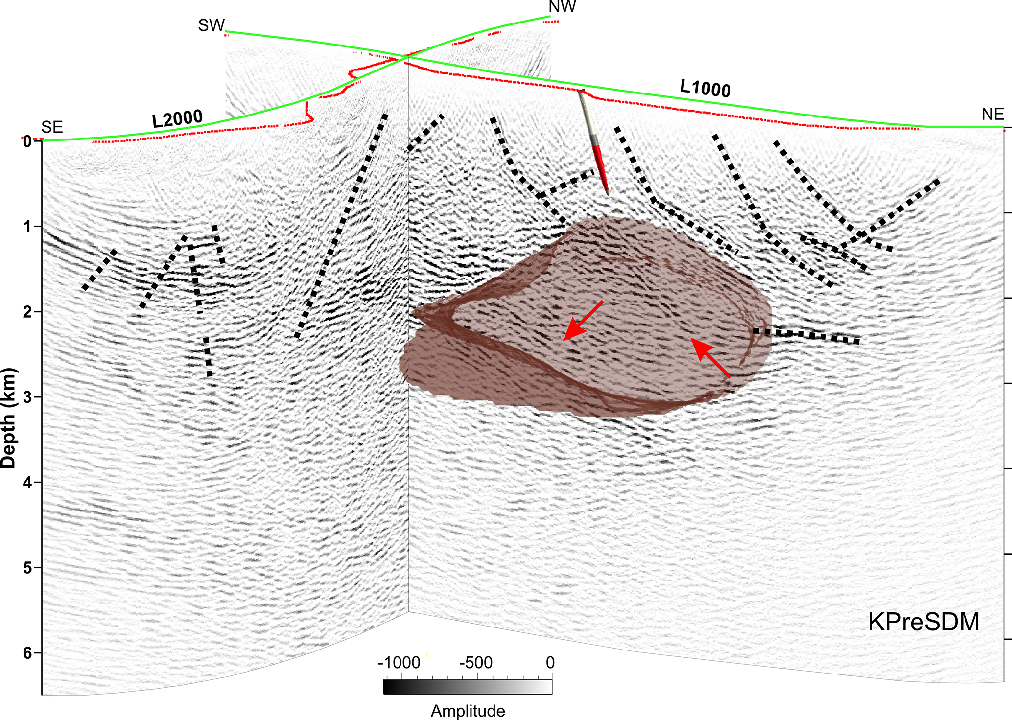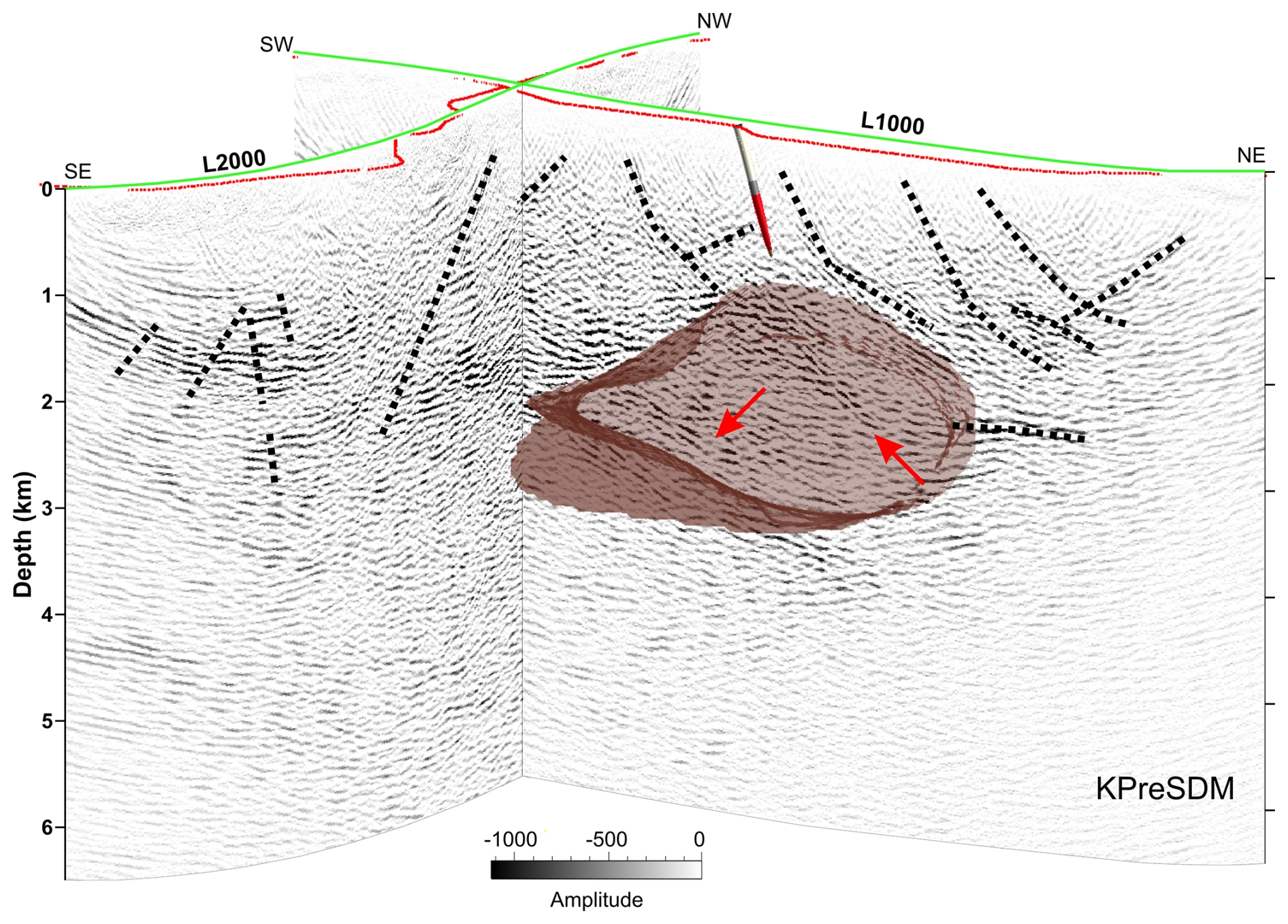 Figure 8Cross-sectional view of KPreSDM with the initial geological volume model of the mafic intrusion and the drillhole. The red arrow marks the delineated internal reflectivity within the magma conduit. Black dashed lines show the possible faults, dykes or lithological contacts present in the area. The green line shows the CDP line shown in Fig. 1c, and the red dots show the source locations along the profiles.