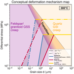 Figure 10Conceptual model for deformation in granitoid rocks. We infer that, in granitoid rocks, not only the deformation mechanism but also the deforming material will change. At strain rates of 10−12 s−1, the deformation will be dominated by qtz GSI creep in grain sizes above 10 µm and transition into GSS creep in the polymineralic mixture of fsp and bt (DPC).