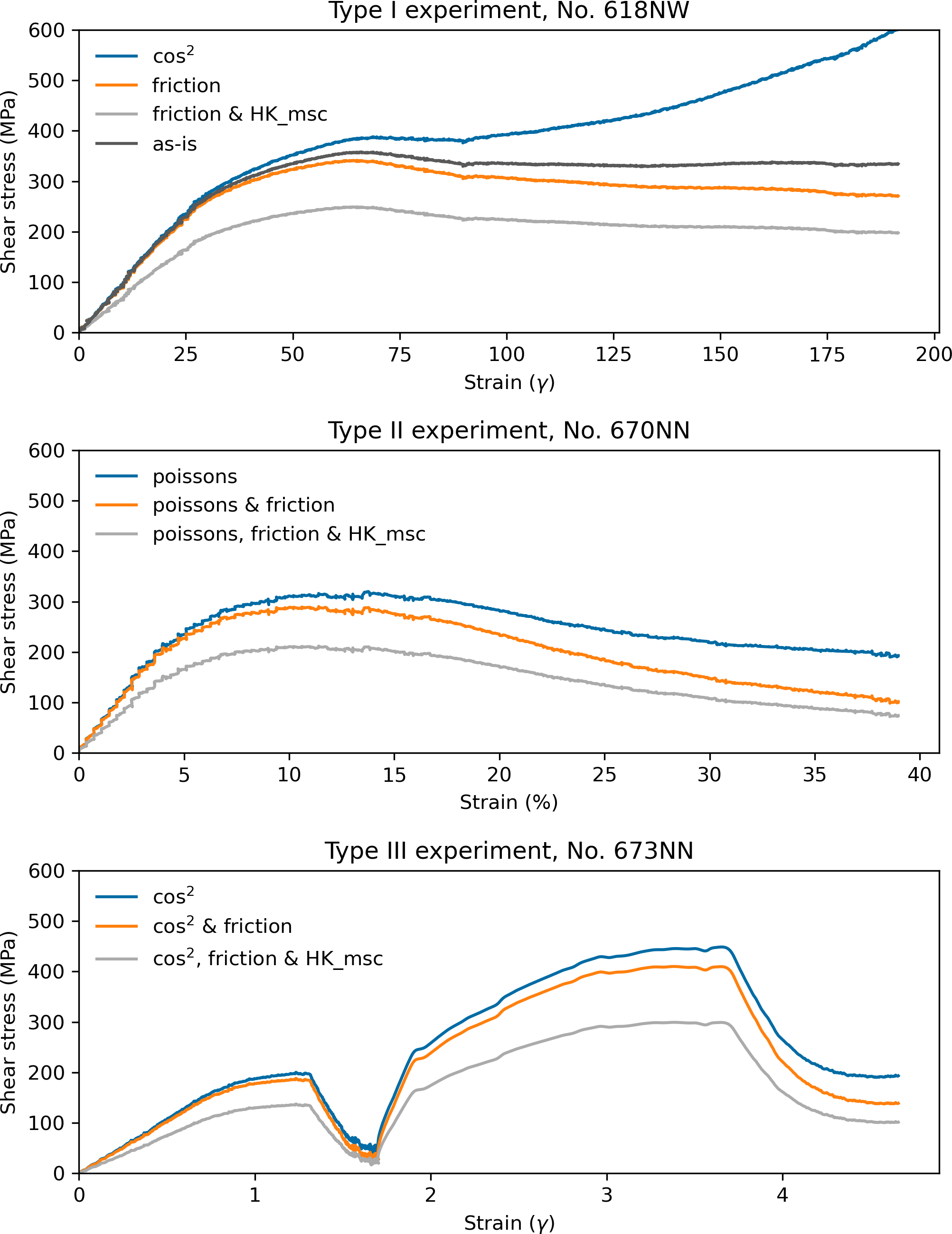 During shear experiments, the area on which the force acts changes continuously, and the recorded load data must be corrected for obtaining shear stress values. In the case of localized shear zones, in Type I and III experiments, there is a decreasing overlap area, resulting in increasing stress values with progressive shear strain. We use the cos2 approximation for the decreasing overlap area for Type III experiments (Heilbronner et al., 2020). In the case of Type I experiments, the strain is beyond the applicability of this correction (should only be applied up to γ<4; Holger Stünitz and Renee Heilbronner, personal communication, 2021), and the correction is therefore omitted. During coaxial shortening, barreling of the sample occurs and leads to an increased cross-sectional area on which the force acts. We assume constant volume to correct Type II experiments for the increasing area with a Poisson ratio correction of 0.5, as described by Pec (2014). This effect is not considered in the correction of Type I experiments, where we use only the friction corrections. A compilation of different corrections and their effect on the mechanical data can be found in Fig. 2.