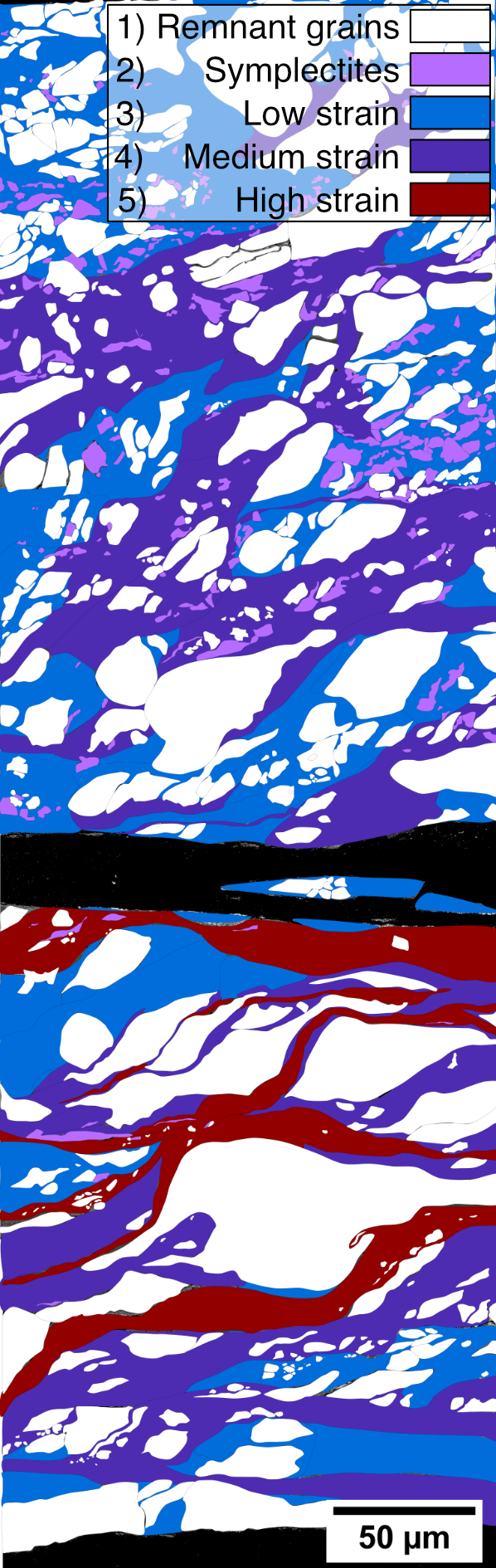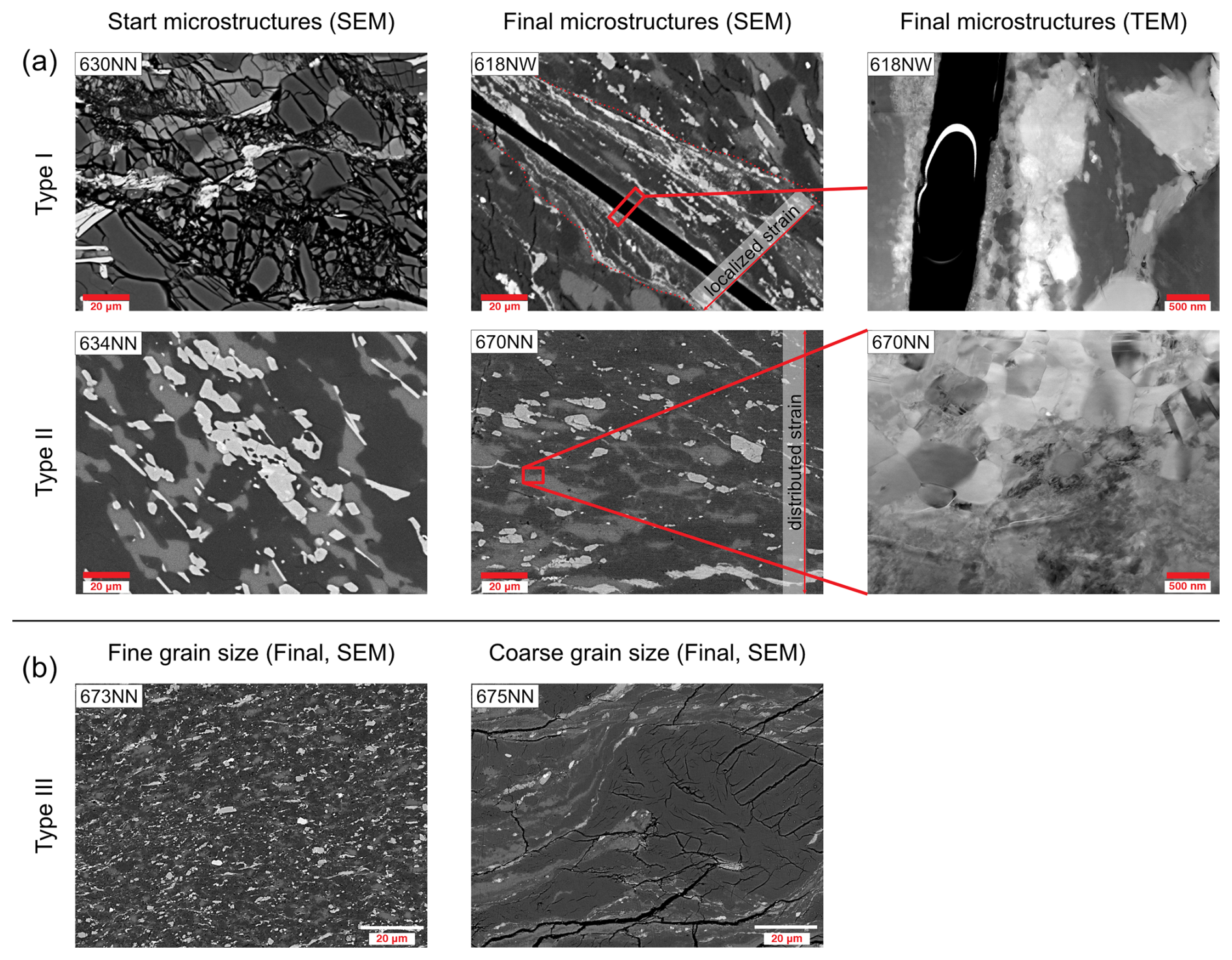 Our experimental samples may not have reached steady-state microstructures yet, especially as observed in Type II and Type III coarse-grained samples. If grain comminution continues, the shear zone is expected to become weaker with progressive strain (increasing the strain rate at constant load). This progression might lead to the acceleration of slip movement of shear zones at mid-crustal conditions at comparable P–T and strain rates to our experiments and might upscale to shallower and colder levels, representing the brittle–viscous transition. At the tips of the shear zones, stress concentrations will develop, causing more grain comminution by potentially brittle processes (Pec et al., 2016) and leading to seismic rupture.