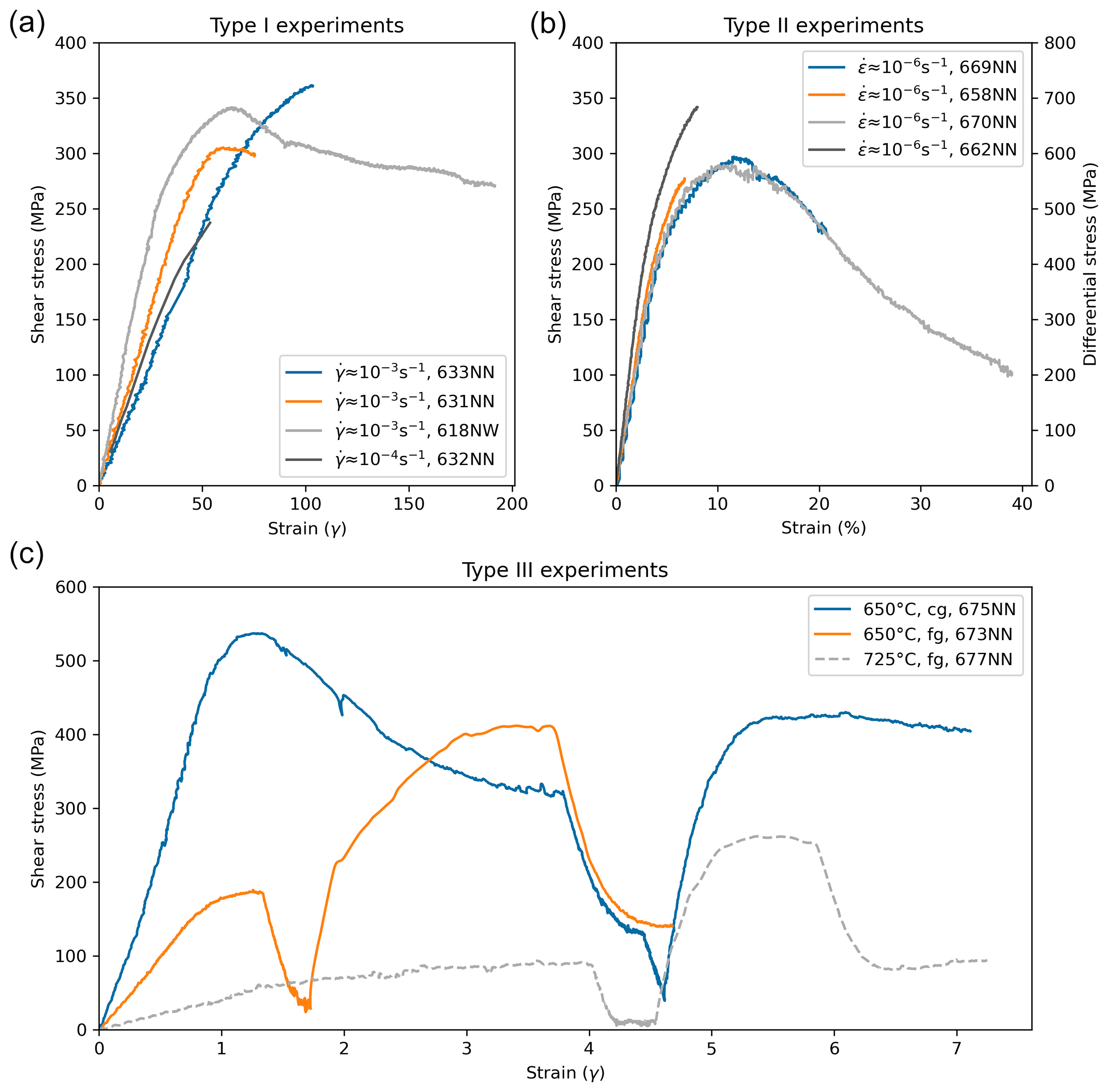 Figure 4Experiments used in this study as stress–strain diagrams. Corresponding experimental parameters can be found in Table 1. Note that, for Type I experiments (a), the initial slope appears not to match; however, this effect is caused by the different shear zone widths leading to different strain calculations at the same vertical displacements. Type II experiments (b) were all performed in the same conditions to different strains. Slight variations in peak stress may be due to compositional changes. Type III experiments (c) are performed with fine-grained (fg) and coarse-grained (cg) material, with varying temperature, and with strain rates in steps. As a result, each increment in the slopes is caused by a change in strain rate according to the rates in Table 1.