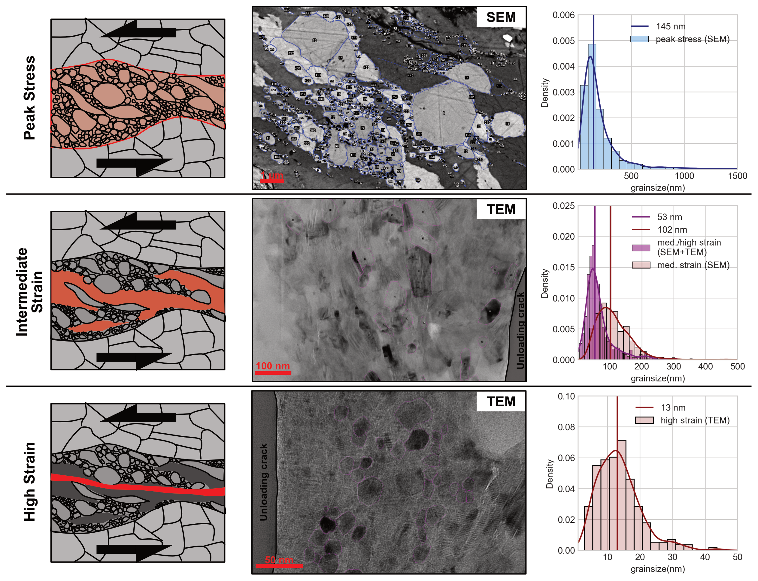 Figure 5Shear zone evolution in terms of strain localization and grain sizes for experiment 618NW as an example of Type I experiments. Red areas in the schematic drawings show the distribution of the deforming zone. Note the varying scale for the grain size distribution, which was chosen to display the dramatic grain size reduction from peak stress to high-strain/steady-state stress zones. Blue and pink lines (for better resolution, see Fig. S2) in the SEM/TEM images are manually drawn for grain size measurements in Fiji ImageJ. The grain size distributions compile measured grains not only from the displayed images, but also from similar comparable microstructural domains.