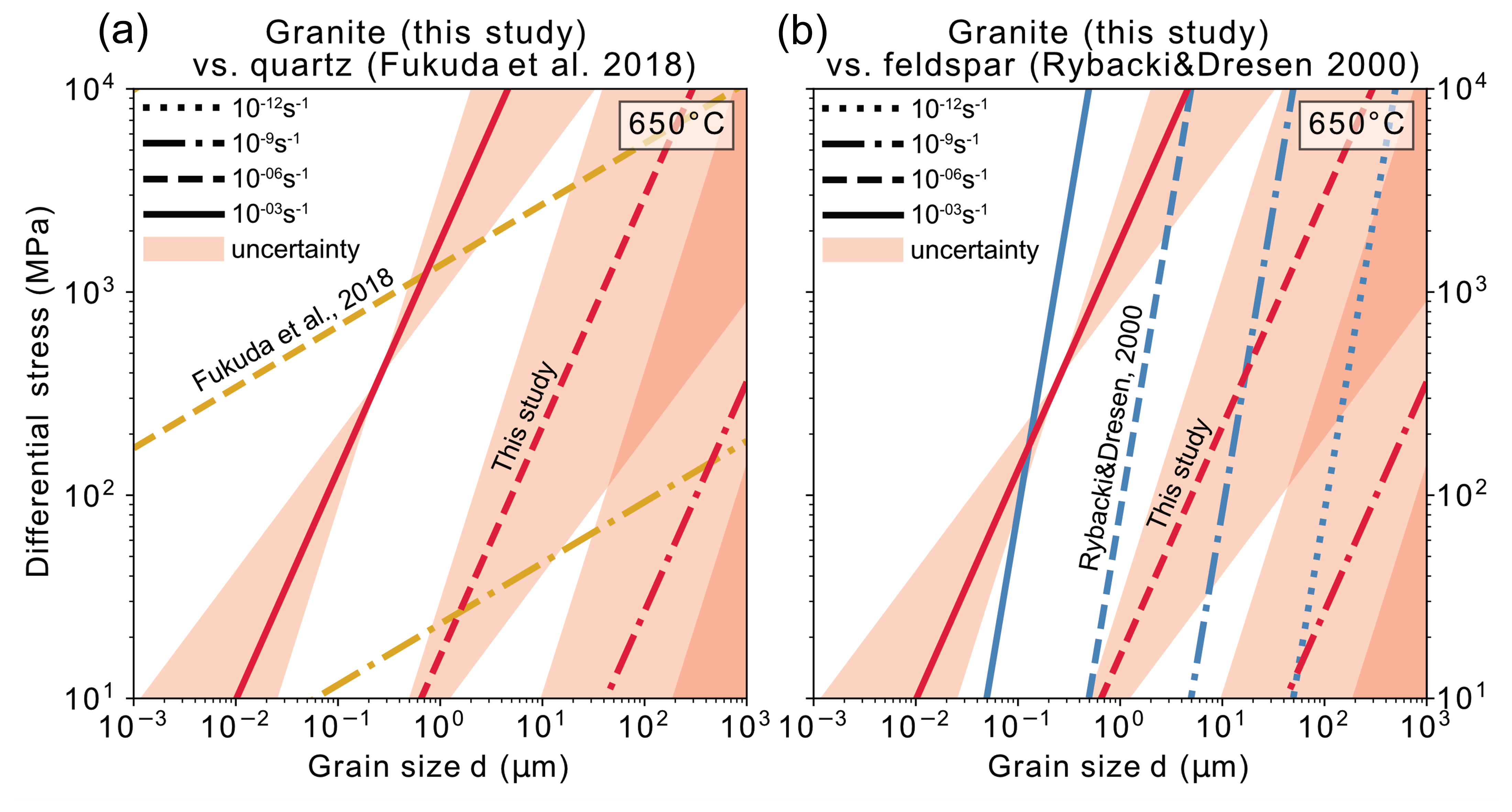 In contrast, the deformation mechanism in our polymineralic granitoid samples at considerably lower temperatures of 650 °C is completely viscous (see Part 1, Nevskaya et al., 2025), and the active GSS creep mechanisms render our samples considerably weaker than quartzites (Fig. 7). Furthermore, the grain size sensitivity of polymineralic rocks is highlighted by comparing experimental studies of granites with different grain sizes to our ultramylonites (Fig. 7; Pec et al., 2016; Sun and Pec, 2021). It is to be noted that our experiments are faster than many other experimental studies, underlining the strength difference between studies and the strong relationship of grain size and strain rate for strength.