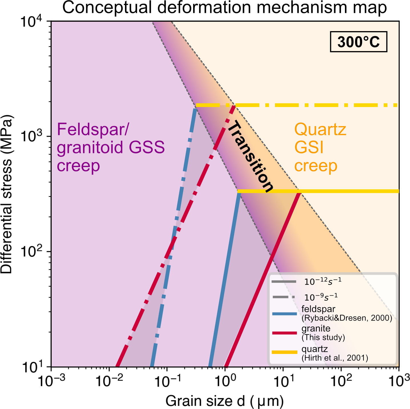 Still, at larger grain sizes than 15 µm, especially coarse, undeformed granites with grain sizes of >1 mm, will be stronger than quartz. We therefore investigate the transition from quartz GSI to feldspar/granitoid GSS creep in a conceptual, two-phase deformation mechanism map (Fig. 10). Usually, in these grain size vs. stress maps, different deformation regimes for one material are plotted (e.g., as in Rybacki and Dresen, 2004). We assume that, in a granitic rock, taken as the deforming material, different deformation regimes that are dependent on the grain size will be active and will also switch the dominant mechanisms between minerals.