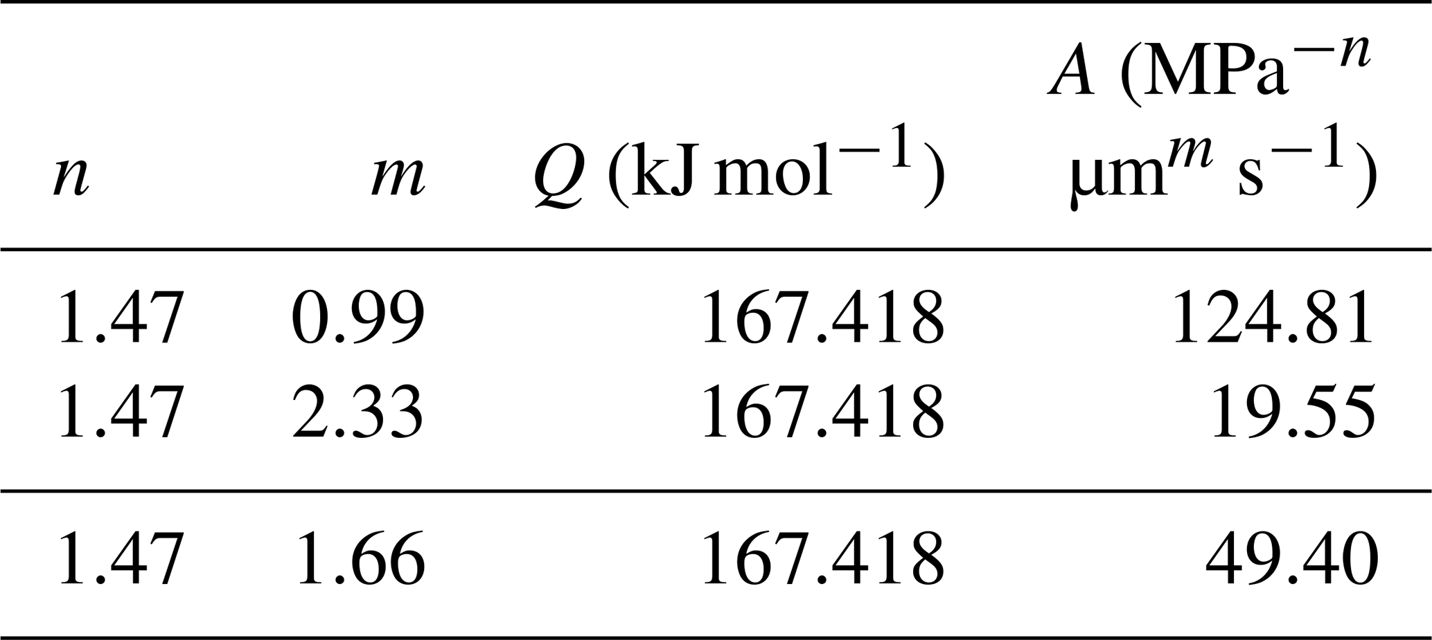 Table 2Calculated flow law parameters from our experiments. The largest uncertainty comes from the grain size exponent m, also leading to different A parameters. We show a minimum, maximum, and average m value.