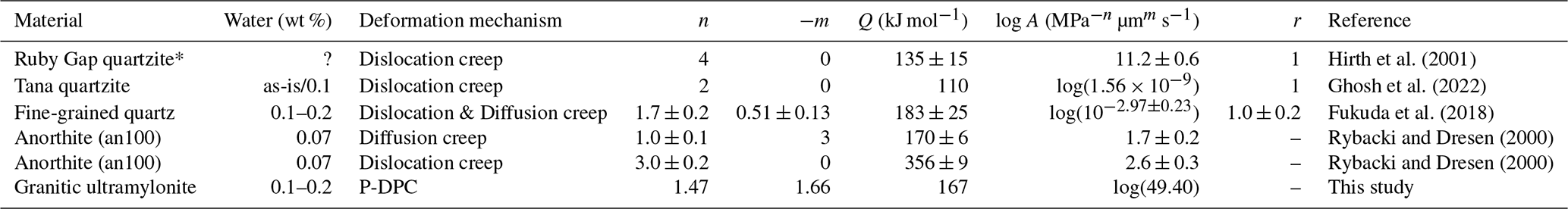 Table 3Flow law parameters of studies we used to compare rheological behavior. n= stress exponent; grain size exponent; r= fugacity exponent (for water) (see Eq. 4).