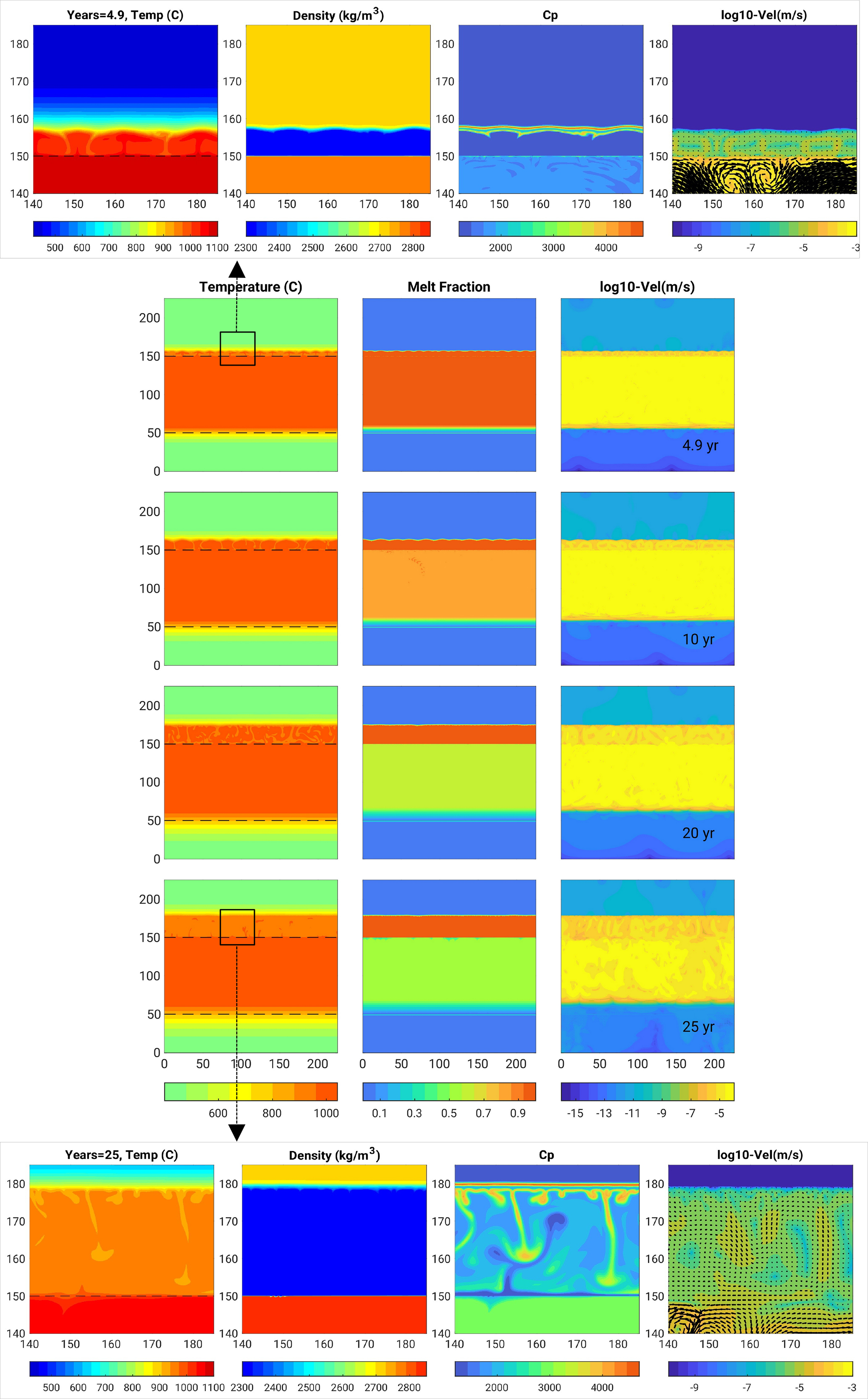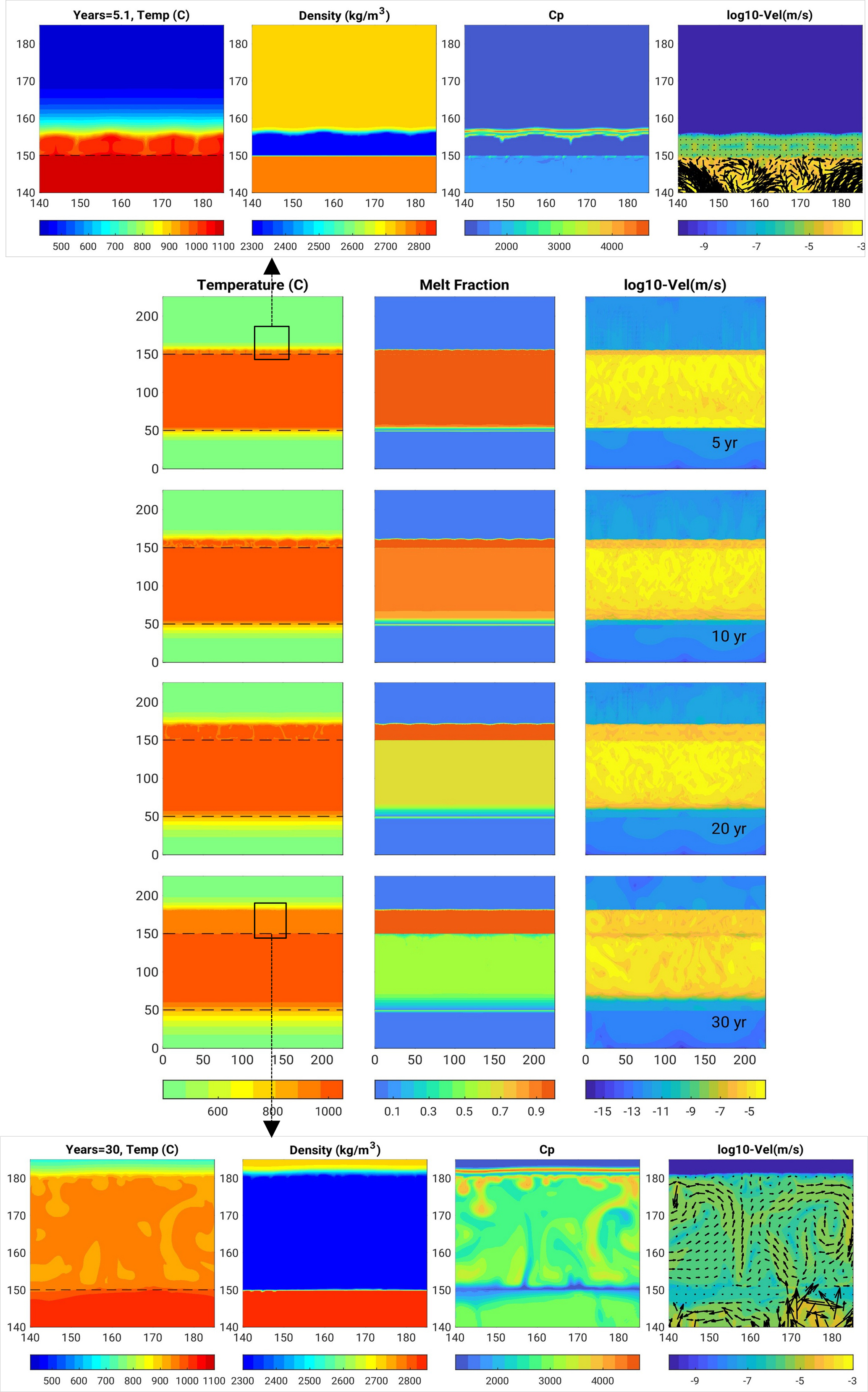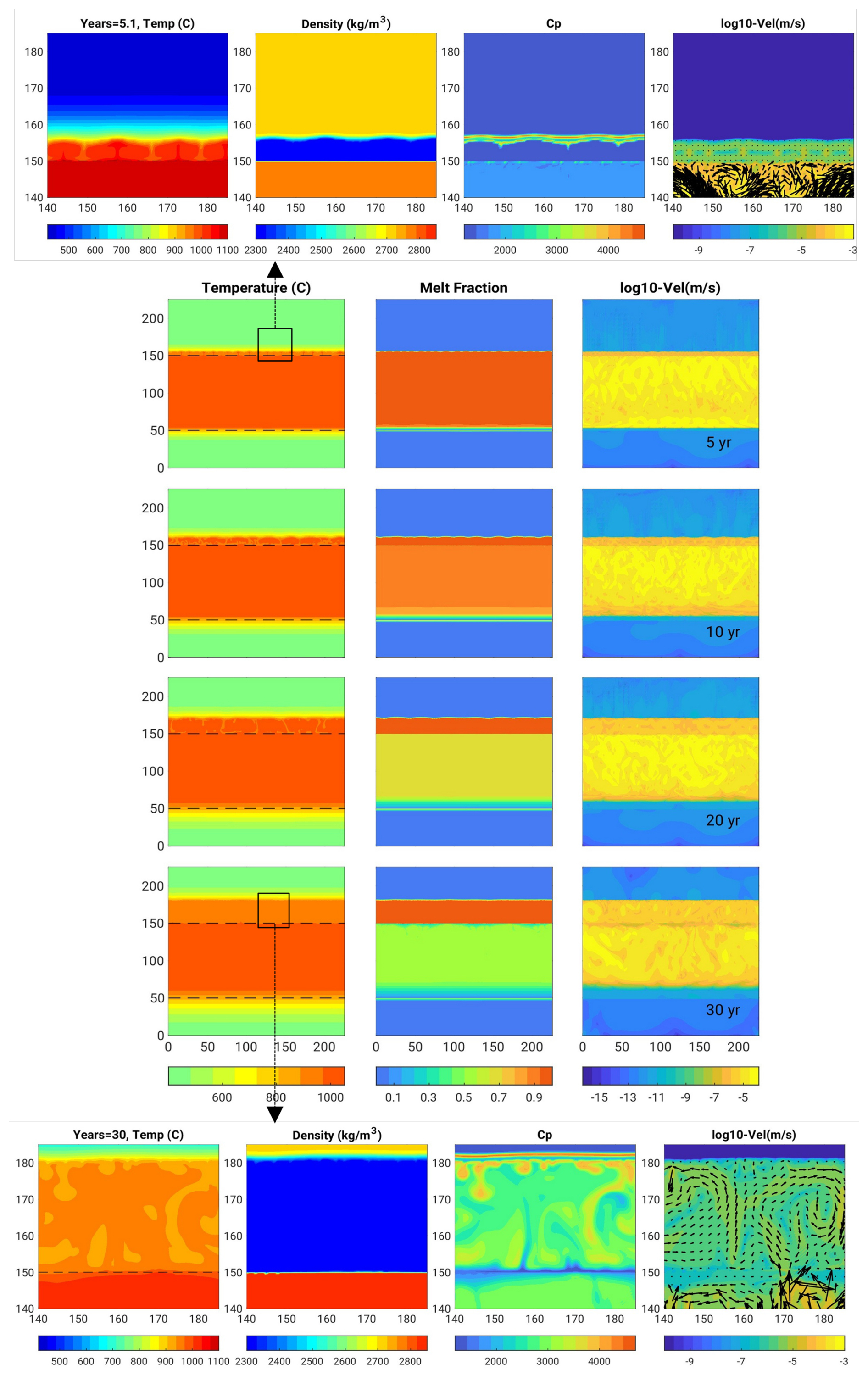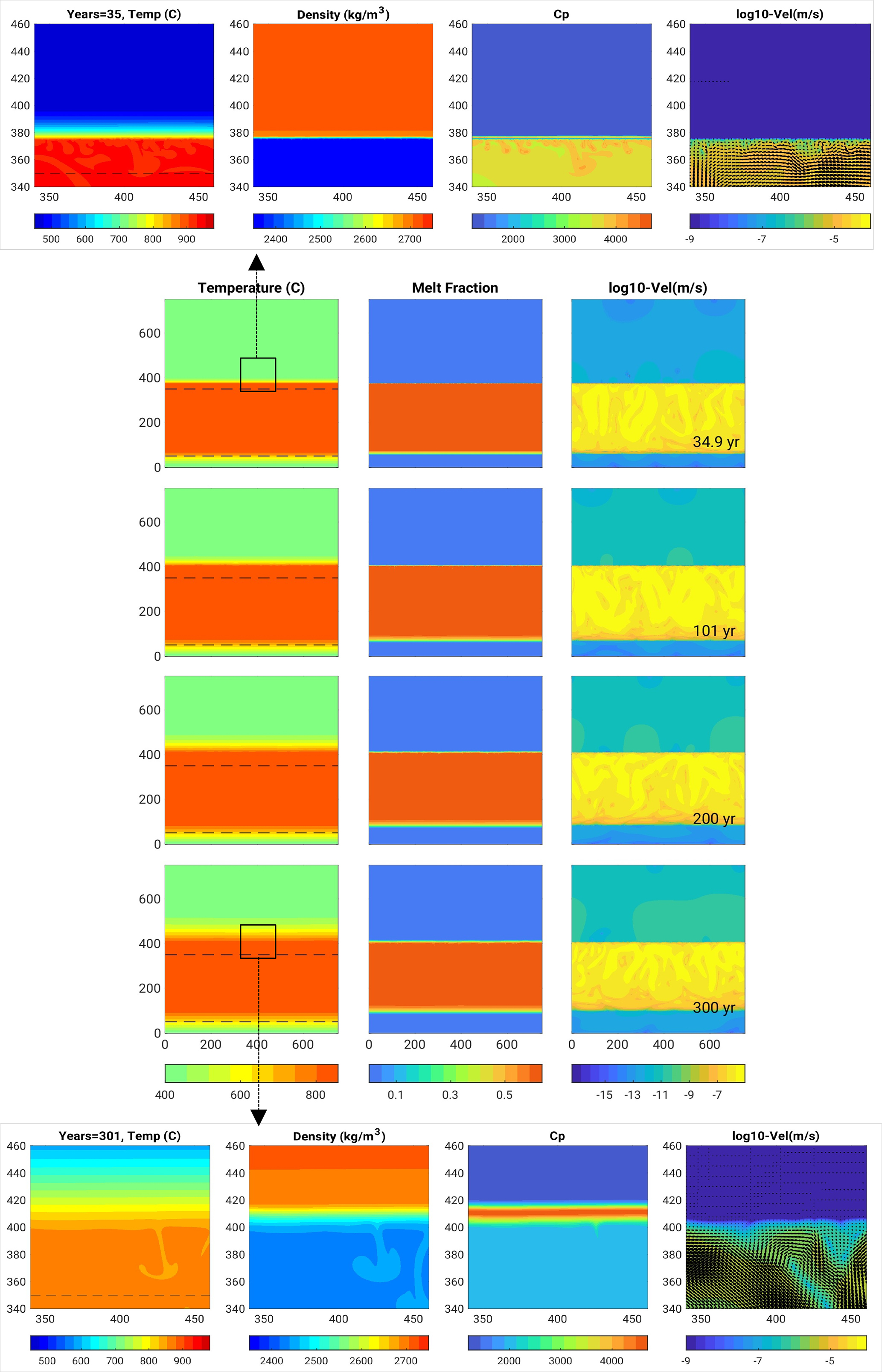 Figure 4Rhyolite intrusion 300 m thick (Scenario 1, model R0.5): In the centre, there are snapshots in time of the temperature (left column), melt fraction (middle) and velocity field (right) over the entire domain size. Dashed lines indicate the initial location of the hot intrusion, and help see heat propagating upwards, together with the melting front and the velocity field. Figures in boxes on the top and bottom are close-ups near the upper melting front displaying temperature, density, heat capacity, velocity after 35 and 300 years, respectively.