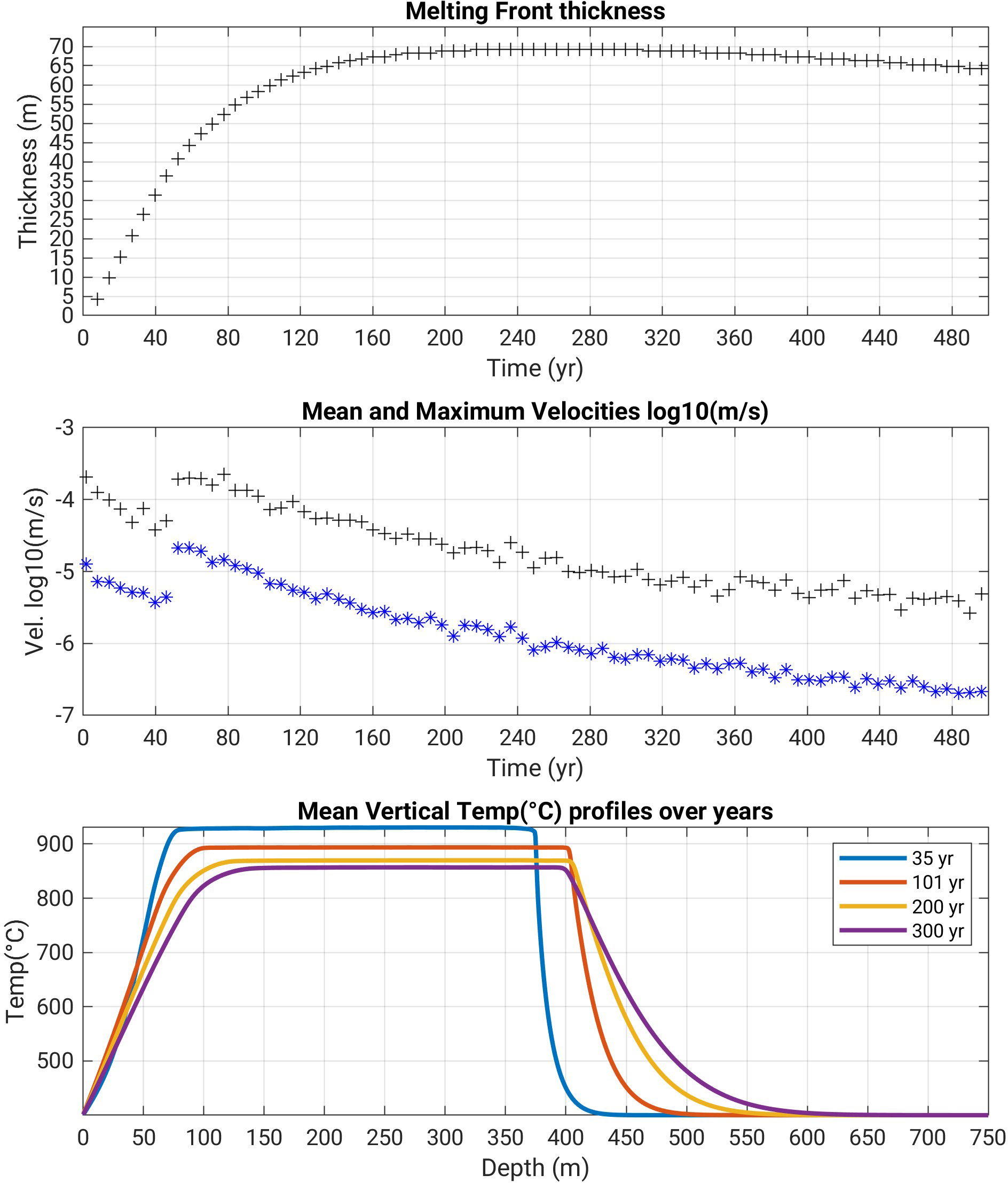 Figure 5Rhyolite intrusion (Scenario 1, model R0.5): Melt front thickness (top, thickness over the initial emplacement depth at y= 350 m) and velocities (middle, in log10 scale) over time, and average temperature profiles with depth (bottom). Note that the melting front thickness starts to decrease from ca. 300 years; the 400 °C jump occurs over 25 m after 35 years, then over more than 150 m after 300 years after emplacement.