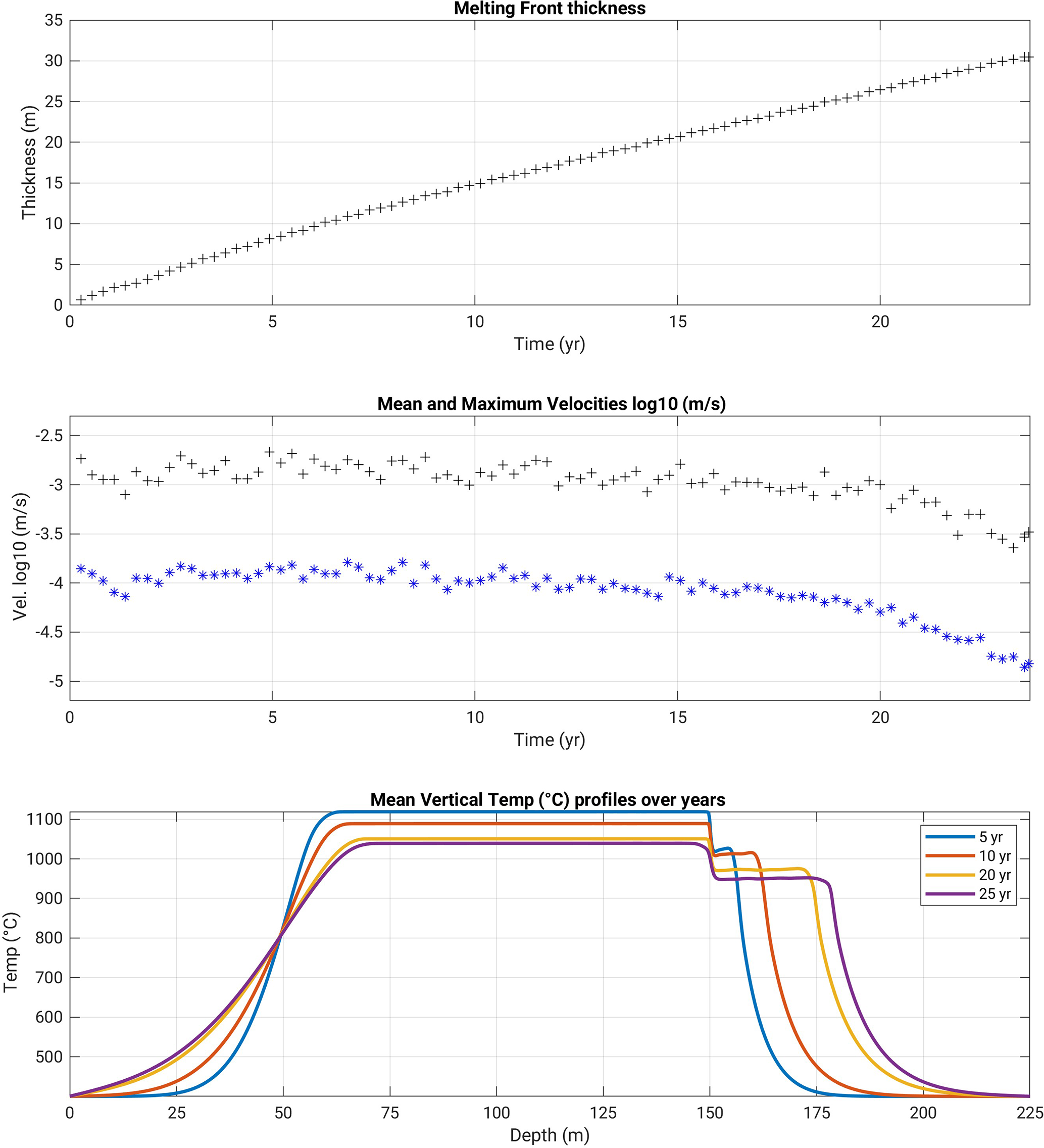 The melting front thickness (the plateau width) reaches ca. 30 m after 25 years, and still displays an increasing trend.