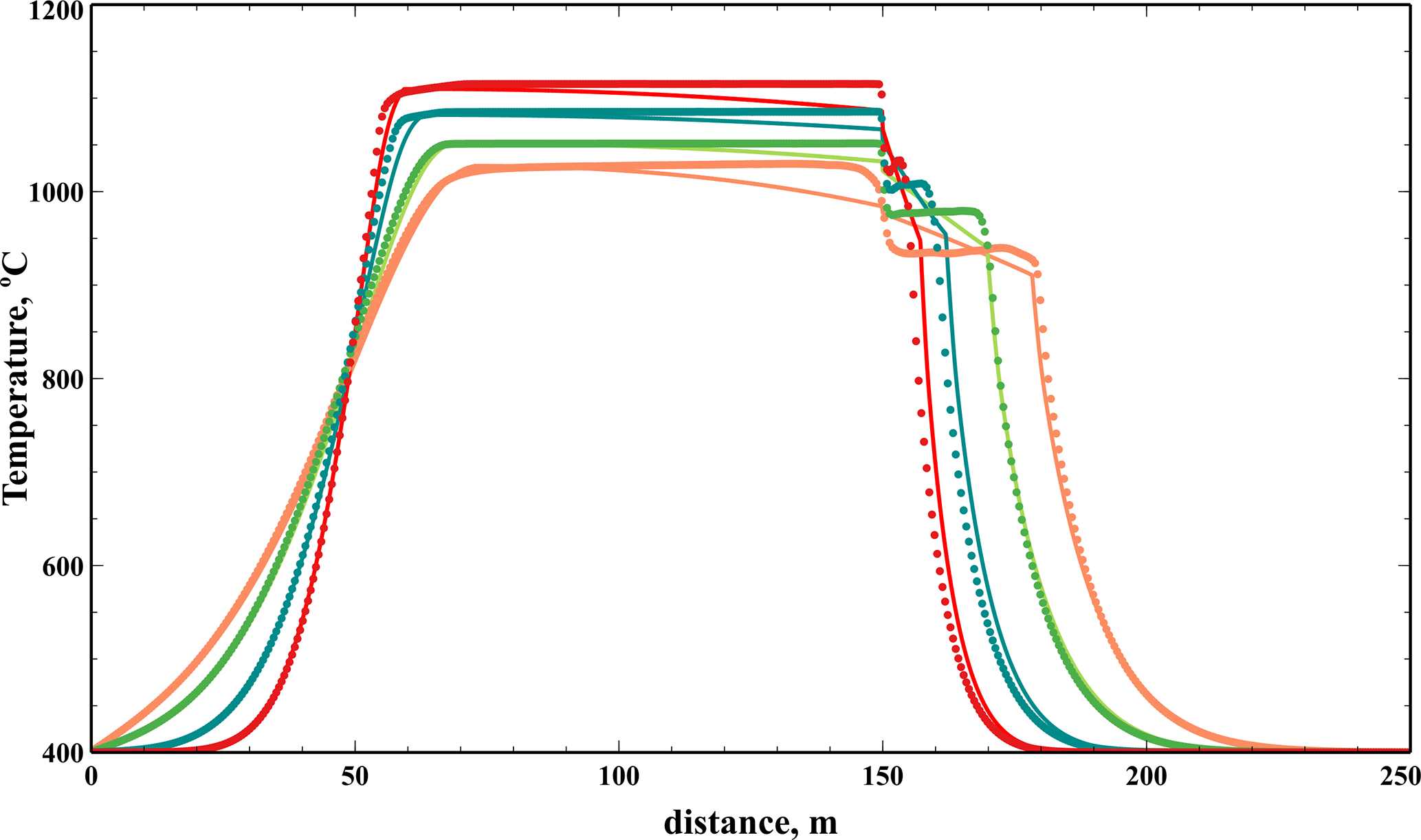 Figure 9Comparison between 2D (dots) and 1D (solid line) averaged temperatures at 5, 10, 20 and 30 years, for the basaltic intrusion (Scenario 2).