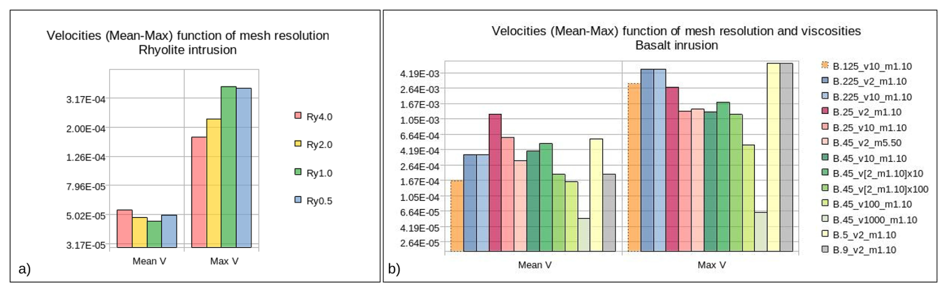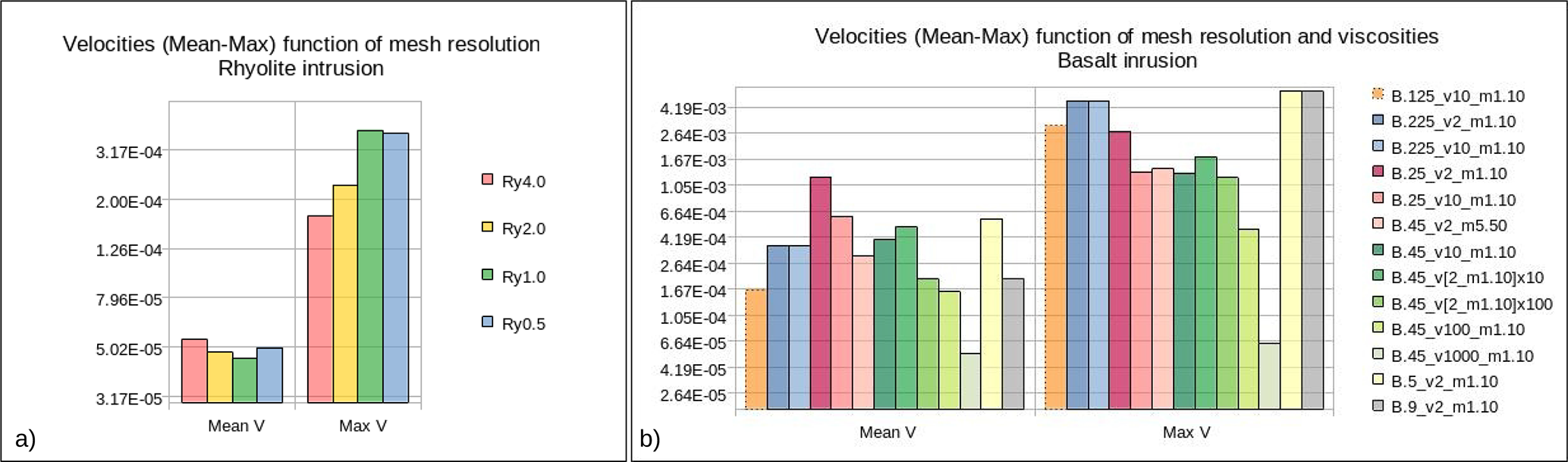 Figures B1 display the velocity magnitudes for all tested cases. For the rhyolite intrusion, we note that mean velocities remain quite similar independently of the mesh resolution. The maximum velocities increase with mesh resolution but reach similar values for the 2 highest resolution cases (5 × 10−5 and 3 × 10−4 m s−1, eg. less than 10 m yr−1, for the mean and maximum velocities, respectively), corroborating mesh convergence.