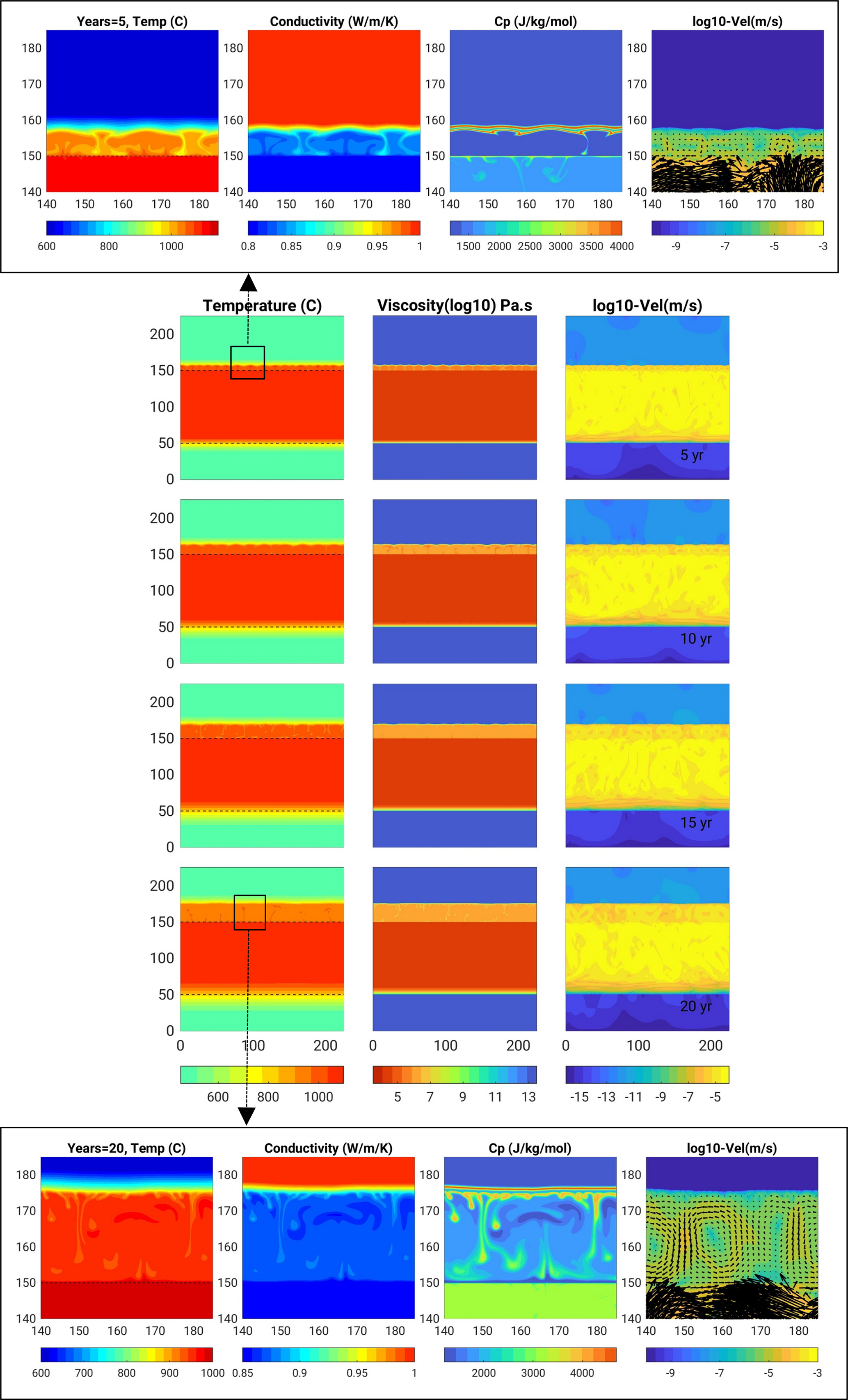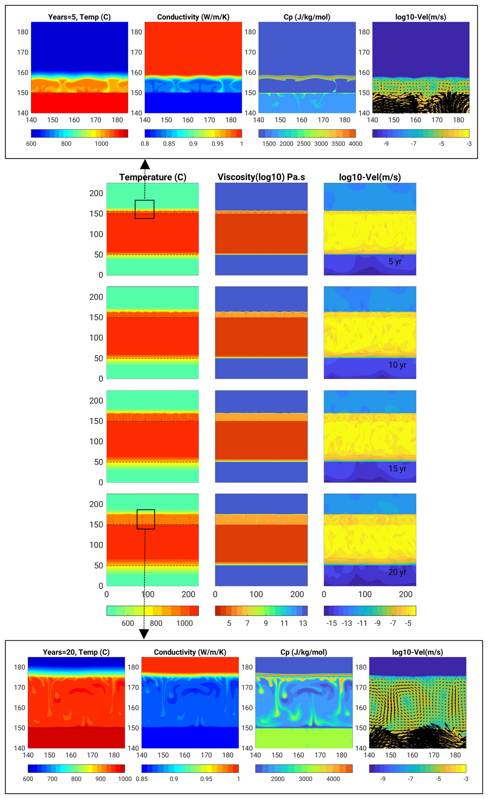 Figure B3Basalt intrusion Scenario (2) with highest resolution of 0.125 m (model B.125_v10_m1-10), and which only reached 20 years. Snapshots display temperature, viscosity and velocity field, and in zoom panels the conductivity and heat capacity.