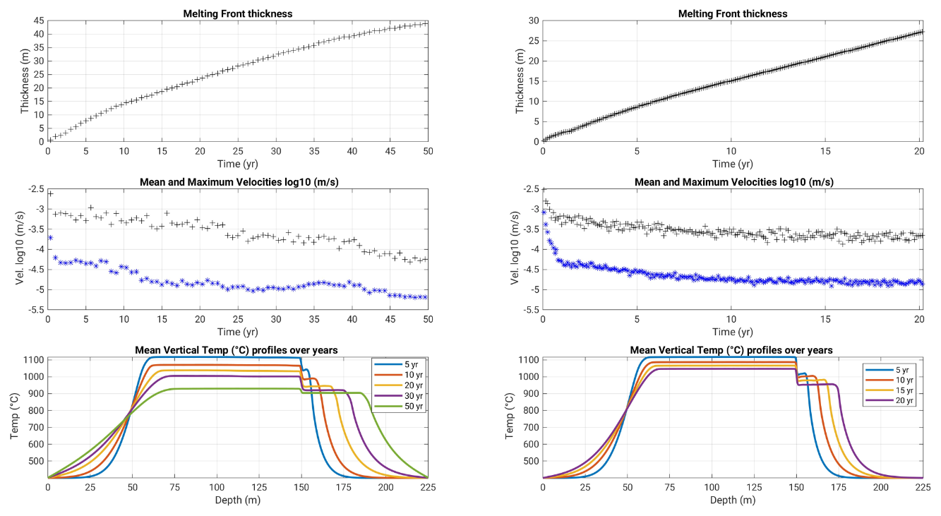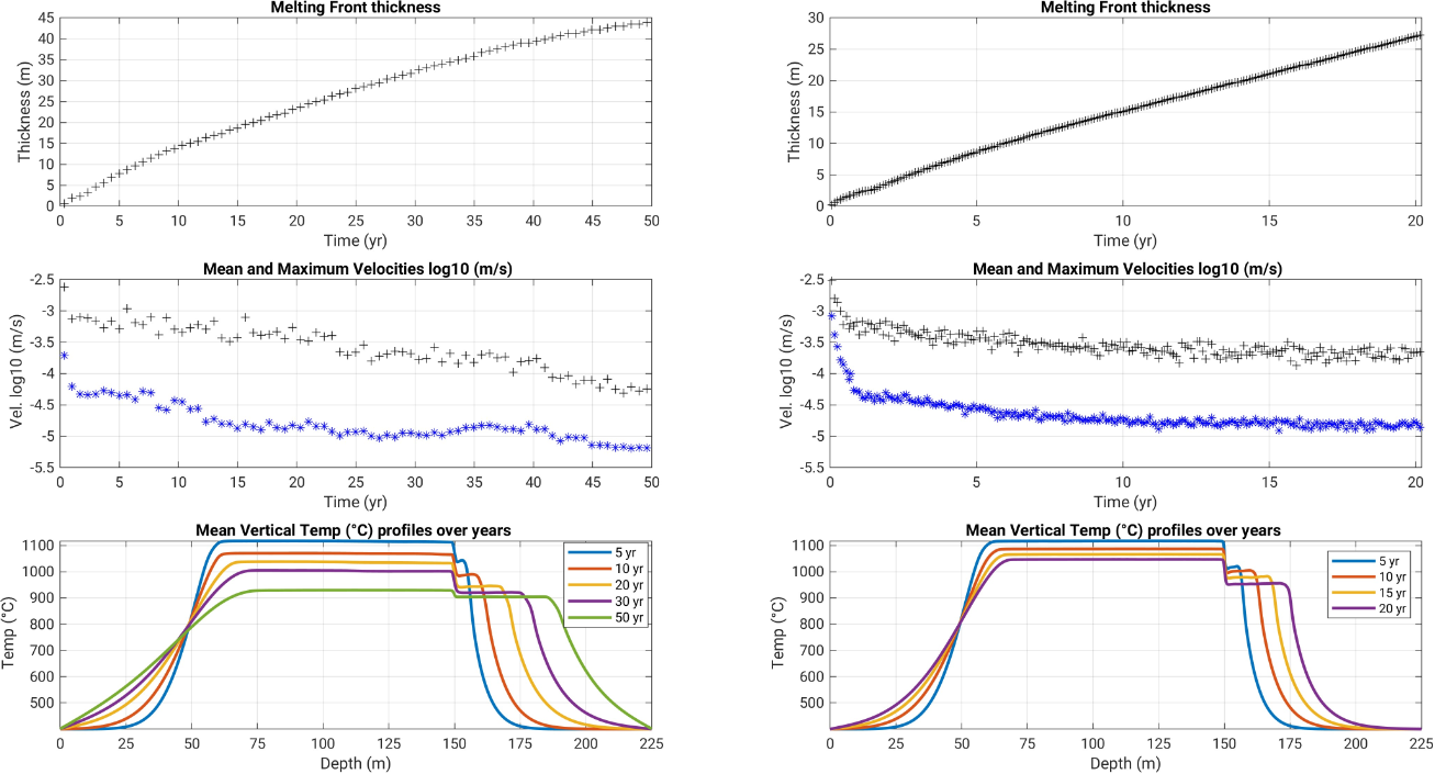 The melting front propagates upwards reaching an additional thickness of about 25 m after 35 years, and then a thickness of 70 m, 200 years following intrusion emplacement.