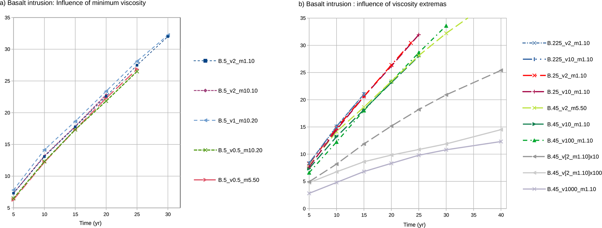 For the basaltic intrusion we also tested the influence of the minimum and maximum viscosities, and the values chosen in this study result from various preliminary tests. The lower limit was not varied since it is already a realistic value obtained from the melting laws given in Appendix A. The upper limit in turn was tested: the higher this value the greater the viscosity contrast but, a large value is useless given the time-scale of the modelled process (decades, much shorter than a higher viscosity relaxation time). Choosing the viscosity of the cold bedrock must still be high enough or else it can destabilize gravitationally (Fig. B6).