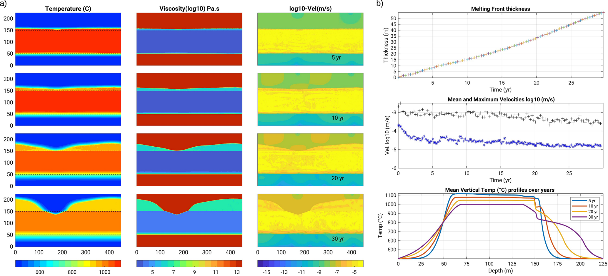 Figure C1Model with a 20 m thick basalt intrusion (BT20.5_v1_m1-20). (a) 4 snapshots of the temperature, melt fraction and velocity fields. Colour bar ticks are for the last displayed time step (30 years). (b) Melting front thickness and velocity magnitudes over time, and temperature profiles over depth: they become conductive after ∼ 7 years (velocity low and smooth temperature profile).