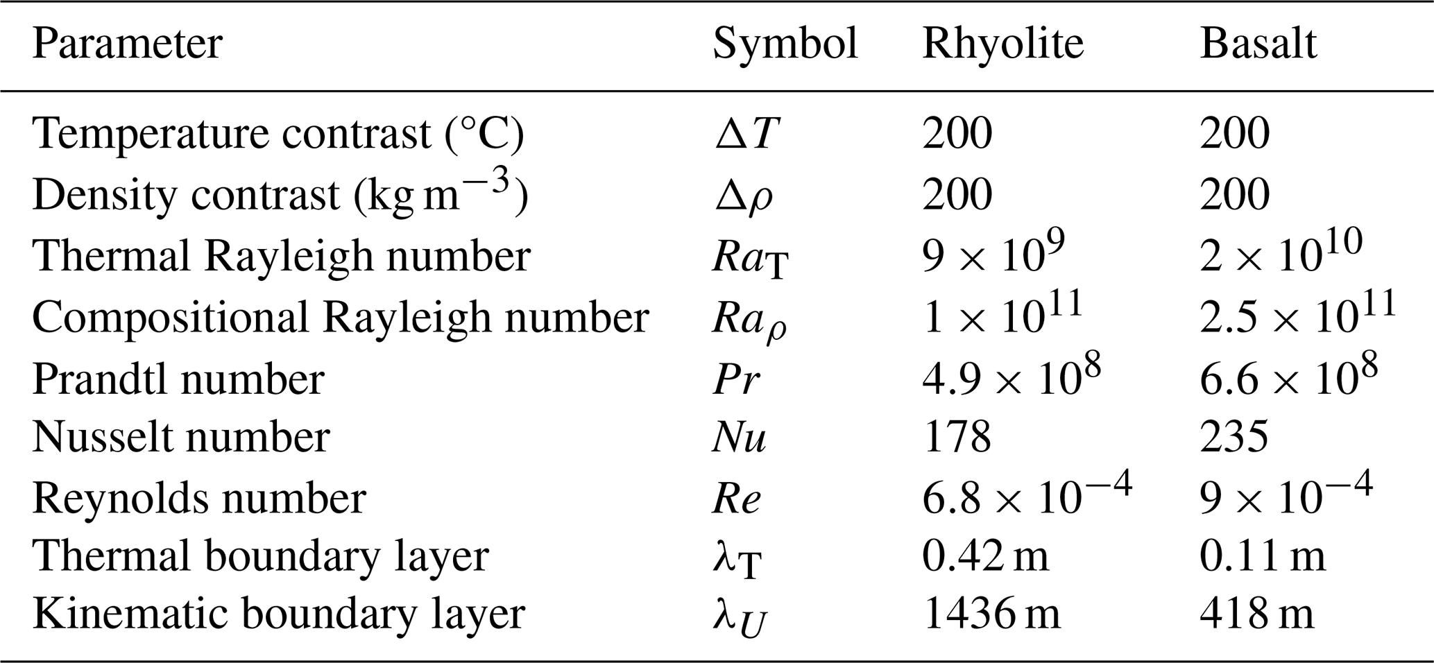 Therefore, we use characteristic density difference Δρ and temperature difference ΔT that fall between the 50 % crystal state and the molten state, for each rhyolite and basalt phases (Marsh, 1981). Analysis of Table 2 reveals that convection is mostly driven by the magma crystallization/melting process, associated with large density variations. Re numbers are small due to high magma viscosity, meaning that the inertia effects remain insignificant and that the flow is mainly controlled by the competition between the viscous resistance and buoyancy. In turn, the large Pr numbers impose the strongest constraints on the mesh resolution, to resolve the thickness of the thermal boundary layer.