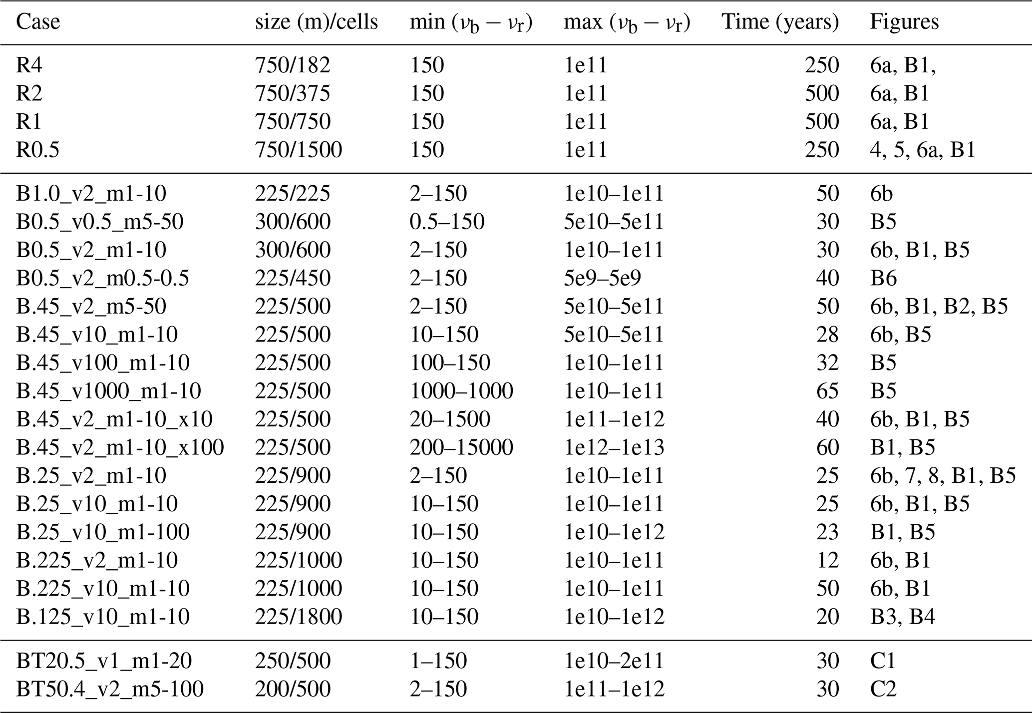 Table 3Model cases, testing the influence of mesh resolution and viscosity ranges. The model name logic is R(meshsize) for Rhyolite cases and B(meshsize)_v(vismin)_m(vismax) for basalt intrusion cases, with “vismin” the minimum basalt viscosity and “vismax” the maximum basalt-maximum rhyolite viscosities factor of 1010 m2 s−1. The last two “BT” cases test the basaltic sill thickness (20 and 50 m). “Time” is the maximum time until which the model could run.