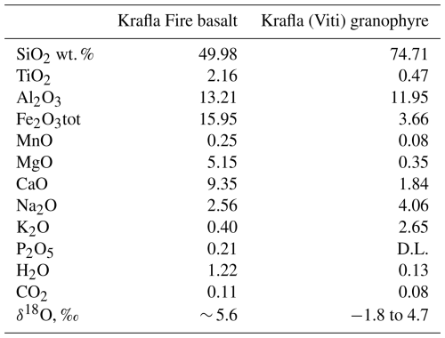 According to drilling logs (Mortensen et al., 2014), the crust above the magma body in Krafla has a felsic composition. The magma uplifted by the drilling fluid also has a high silica content and ranges from crystal-free rhyolites to partially molten felsites, also called granophyres (Borisova et al., 2023). The debate about the nature of the intruding magma body is long-standing (e.g. Zierenberg et al., 2013; Rooyakkers et al., 2021), regarding whether not only basaltic but also rhyolitic magma intrusions caused the production of the felsic magma drilled in both the KJ-39 and IDDP-1 wells between 2008 and 2009 (Mortensen et al., 2010). Bimodal compositions of the erupted products were noticed since Grönvold and Mäkipää (1978), with lavas north of the caldera being more primitive than those inside the caldera during the first three eruptions (1975–1977). Presently, petrological studies indicate that a single reservoir cannot explain this bimodality (e.g. Rooyakkers et al., 2021). The recent study of Rooyakkers et al. (2024) invokes the necessity of short basalt–rhyolite mixing timescales (e.g., hours or days) and the ascent of both primitive and evolved basaltic magmas, driven by episodes of plate-boundary rifting during the Krafla Fires.