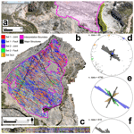 Figure 2(a) Aerial view of the Pontrelli quarry, Altamura, Italy. The quarry pavement is highlighted in pink, while the analysed quarry wall is highlighted in green. (b) Orthomosaic of the quarry pavement, with digitized fractures and interpretation boundary. (c) Orthomosaic of the interpreted vertical wall, with digitized fractures and interpretation boundary. (d) Field data collected along the quarry walls. The stars represent the medoid of each cluster. Each medoid is colorized with the color of the set according to the legend. (e) Rose diagram of orientation data collected from fracture traces on the orthophoto of the pavement (b). (f) Rose diagram of orientation data collected from fracture facets on the digital outcrop shown in (c).