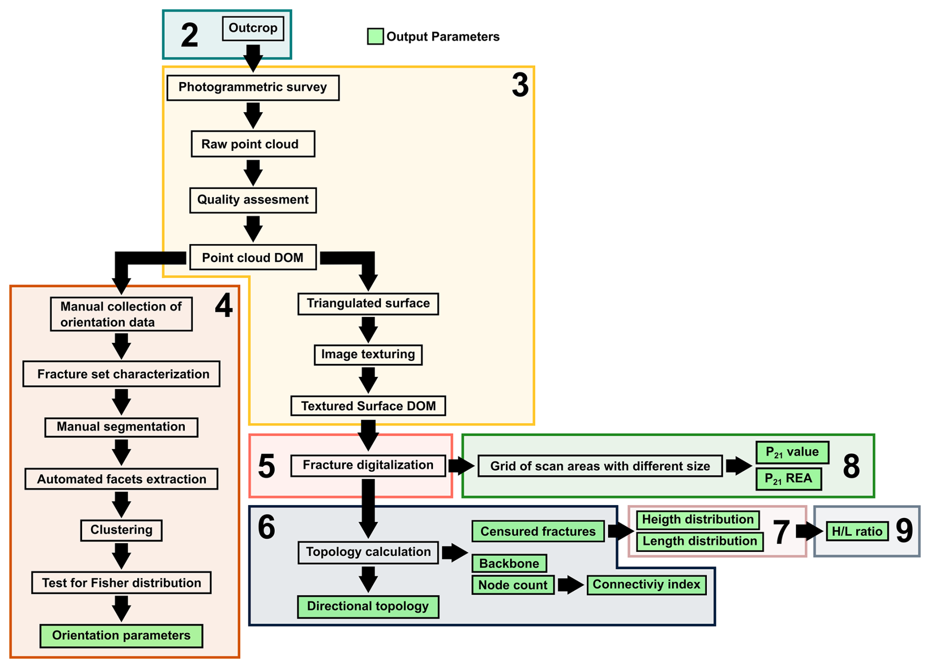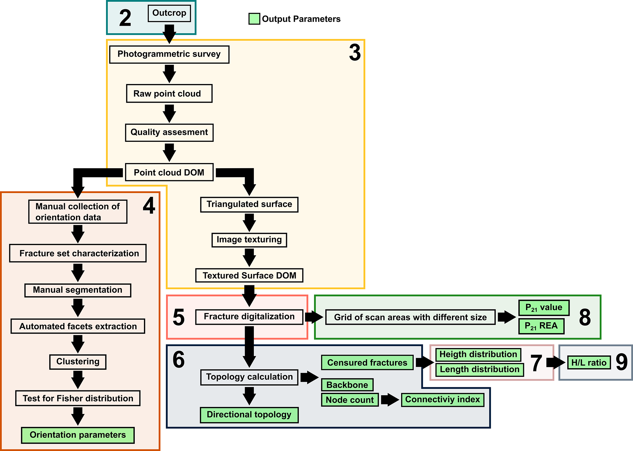 The first part of the paper is dedicated to best practices about data acquisition (both ground-based and UAV-based), pre-processing, reconstruction and quality assessment of a photogrammetric model (Sect. 3). Then two separate processing pipelines are presented, depending on the DOM type: (i) semi-automated fracture orientation analysis carried out on point cloud DOMs (Sect. 4.4); and (ii) fracture trace analysis carried out on orthomosaics, allowing to measure topological relationships, length and/or height distributions, P21, and to estimate (subject to assumptions) the H L ratio distribution (Sect. 5–8).