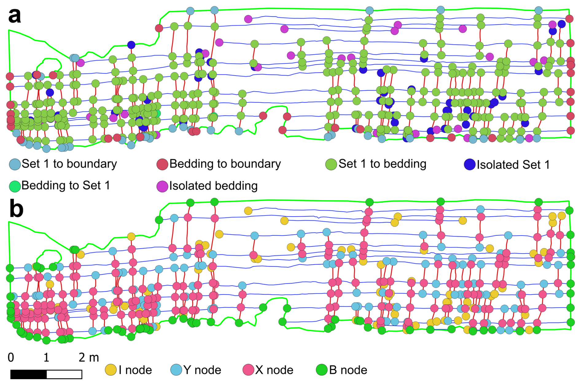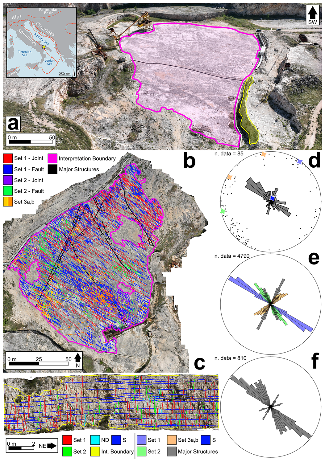 The pavement (Fig. 1a and b) presents some no data zones – where no data can be collected at all, due to debris patches or the presence of strong concentrations of non-natural features produced by quarrying activities. Other zones distributed across the pavement are partially affected by non-natural, quarrying-related fractures, but with a careful analysis it is still possible to detect Set 1, while Set 2 and especially Set 3, being composed of smaller fractures, are more difficult to interpret and separate from the ones related to quarrying. Regarding the quarry walls, here we present data on the NW wall (Fig. 2c), that is less disturbed by quarrying activities and favourably oriented with respect to Set 1 and 2, while Set 3 is sub-parallel to the wall. The wall is around 6 m tall, and according to the stratigraphic analysis proposed by Panza et al. (2016), includes a bed package developed above the quarry pavement, which is one major subaerial exposure surface, while other prominent subaerial exposure surfaces are not detected inside the wall.