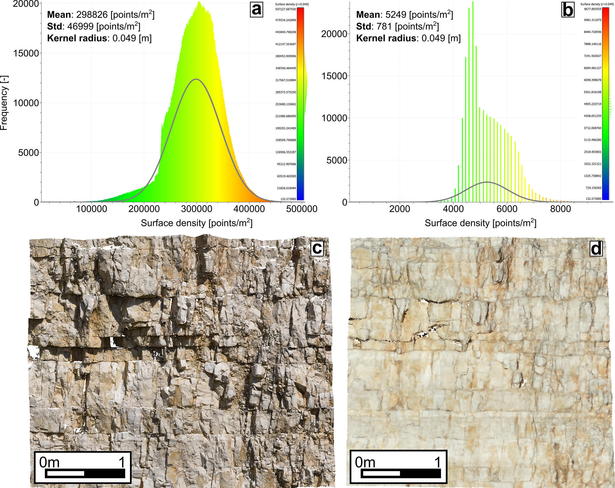 Figure 3Comparison between two different PC-DOMs of the same vertical outcrop. (a, b) frequency distribution of the SD measured with a kernel of 0.049 m. The parameters are obtained by fitting a Gaussian model. (c) PC-DOM reconstructed from photos collected with a high-resolution full-frame mirrorless camera. (d) PC-DOM reconstructed from photos collected with a commercial drone and a simplified acquisition scheme. Point size has been magnified five times, for visualization reasons.