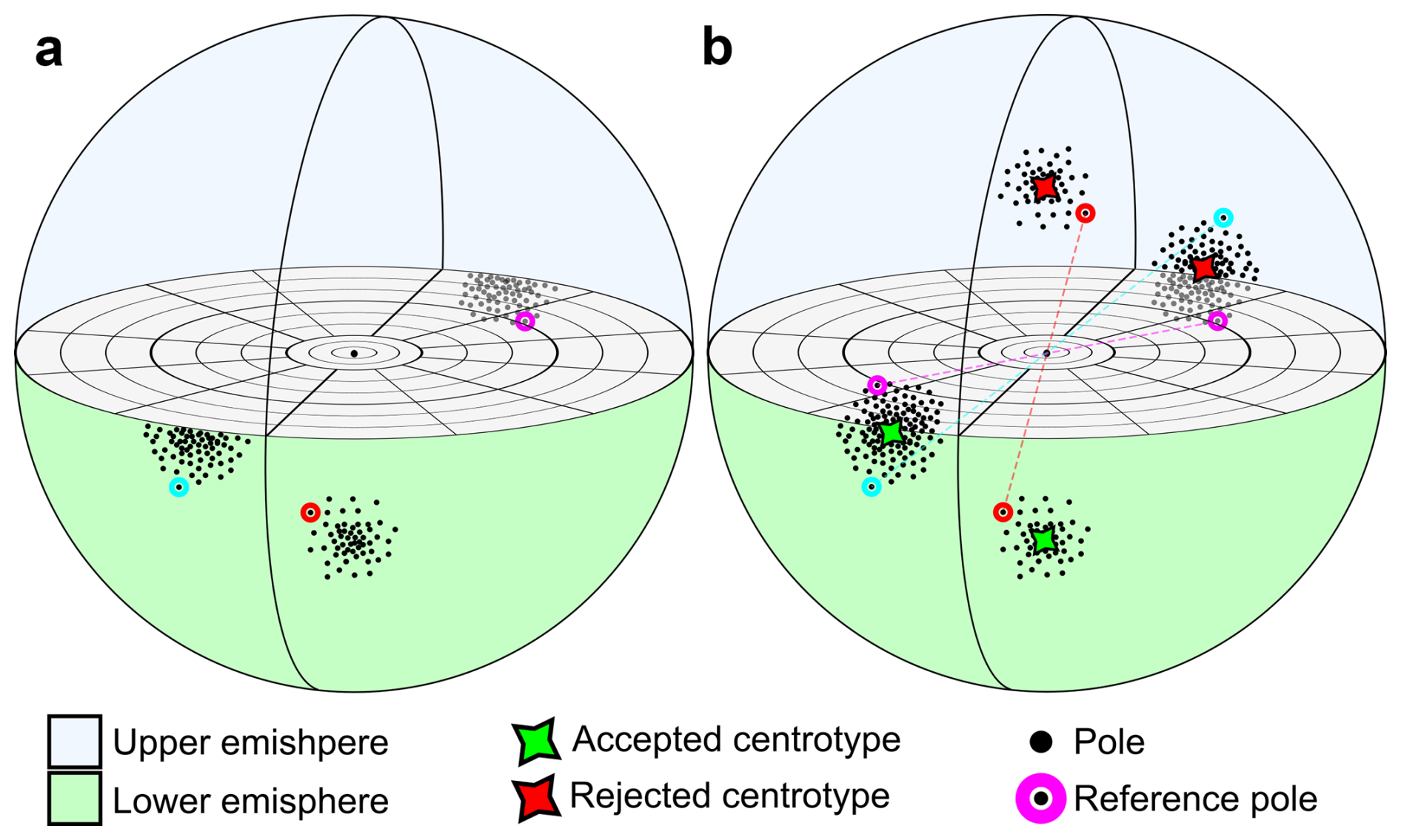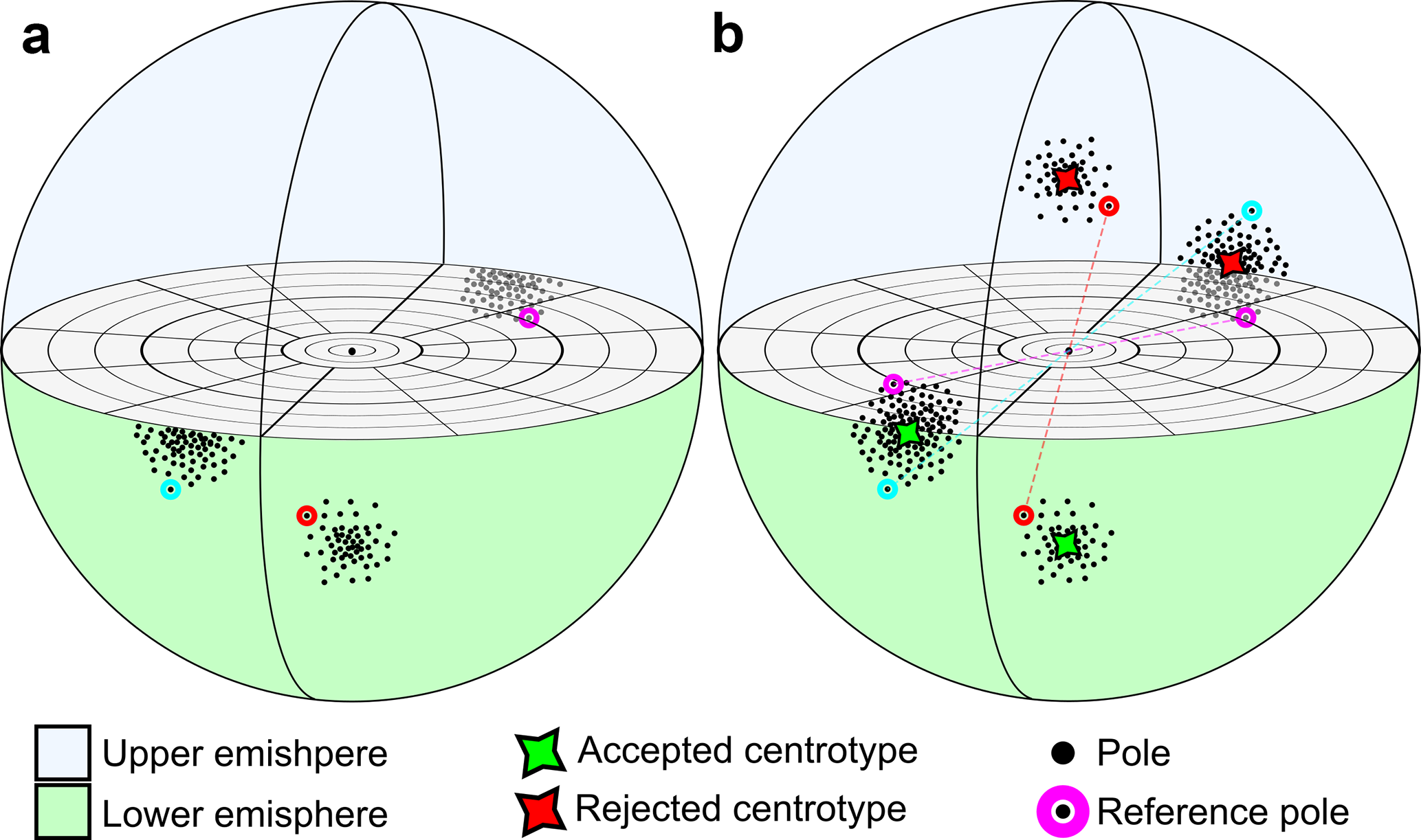 Finally, to avoid the sense ambiguity of orientation unit vectors discussed above, particularly critical for clusters of sub-horizontal vectors that can be mirrored across the stereoplot equator, we have developed a solution based on mirroring all input data. For each input vector vi we create another vector −vi with parallel direction and opposite sense (i.e. pointing in the upper hemisphere, Fig. 4). Then we perform the K-medoids clustering on this duplicated dataset, extracting 2km clusters both in the upper and lower hemisphere. Given the symmetry imposed by duplicating the data with mirroring, also the resulting 2km medoids will be symmetrical, with each medoid in the lower hemisphere having a perfectly symmetrical pair in the upper hemisphere and vice versa, then to conclude the analysis we extract just the km clusters with the medoid pointing downwards, in the lower hemisphere (Fig. 4).