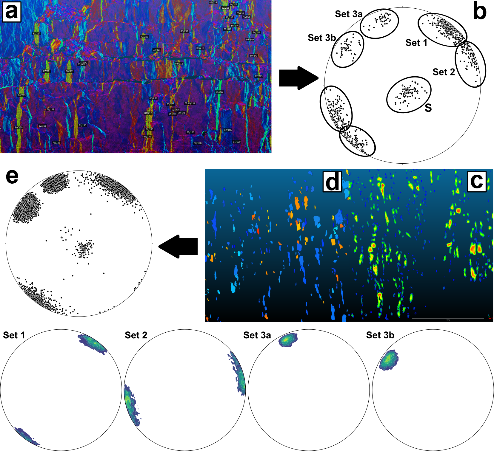 Figure 5Scheme of the semi-automatic workflow for segmenting the point cloud presented in Sect. 4. Point cloud colored based on dip direction with a HSV 380 colour scale. (a) Manual data collection on PC-DOM. (b) Manually collected orientation data during the preliminary orientation analysis. Number of data: Set 1=351, Set 1=256, S=87, Set 3a=74, Set 3b=42. (c) Manual segmentation of the PC-DOM. (d) automatic feature detection with FACETS plugin. (e) Final result of the semi-automatic extraction workflow. Each fracture set is individually shown with contour lines.