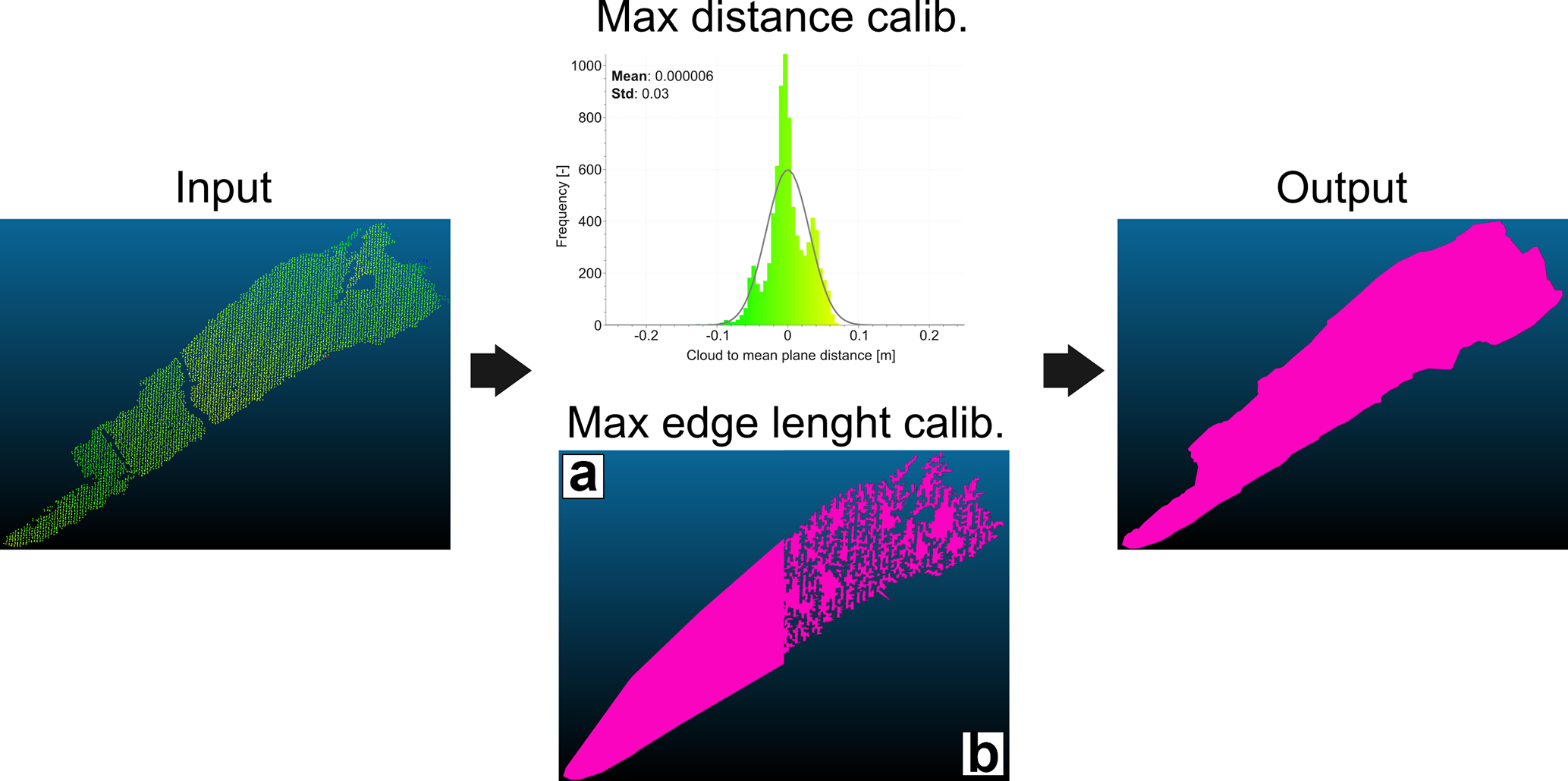 Figure 6Example of the parameter calibration on a single facet. The max distance is calculated as the mean of the frequency distribution of the distances from the mean plane. (a) Example of a planar feature extraction when the max edge length parameter is too low. (b) When the max edge length is too high the planar feature results in a non-representative polygon. When the parameters are correctly calibrated the output planar feature precisely follows the point cloud border and no point is excluded from the interpolation for a too low max distance value.